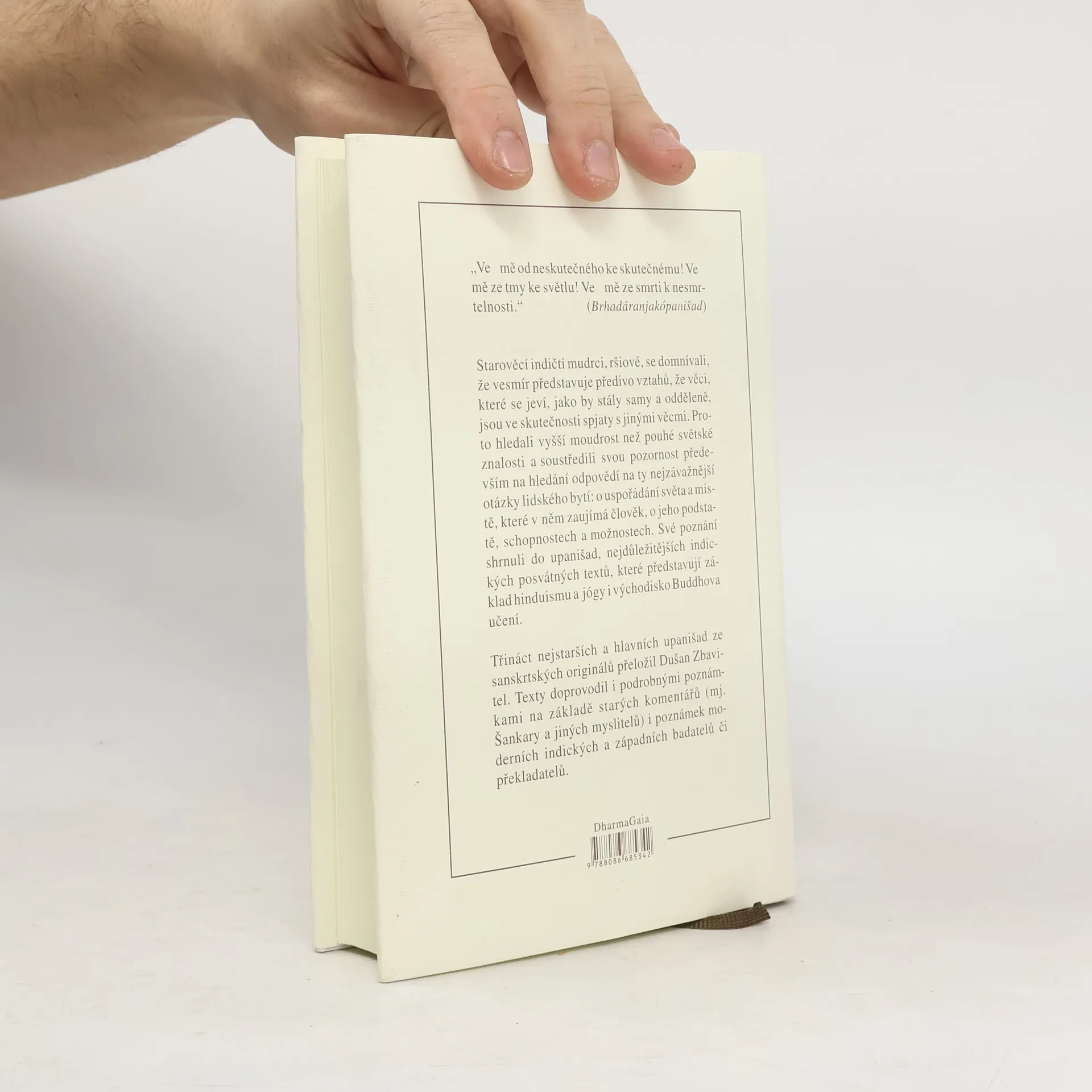 Skvost světové literatury, nejvýznamnější a filosofické posvátné texty staré Indie (8.–3. stol. př. n. l.), mají kulturní význam srovnatelný s biblí. Jsou základem hinduismu, jógy a indické filosofie, a také východiskem buddhismu. Obsahují třináct starých indických posvátných textů, mezi nimiž jsou hlavní upanišady jako Brhadáranjaka, Čhándógja a další. Překladatel Dušan Zbavitel, který za svůj překlad obdržel Státní cenu, doplnil texty podrobnými poznámkami založenými na starých komentářích a moderních badatelích. Toto období, považované za "osovou dobu lidských dějin", bylo klíčové pro formování světového myšlení. V té době žili významní myslitelé jako Buddha a Konfucius. Starověcí indičtí mudrci, ršiové, usilovali o vyšší moudrost a zkoumali spojení mezi lidským bytím a kosmickými skutečnostmi. Zatímco védské texty se soustředily na rituály, upanišady se zaměřily na lidskou osobu a její místo ve vesmíru. Závěrem upanišad je rovnice: átman, podstata "já", se rovná brahma, nejzazší realita světa. Tyto texty, bohaté na podněty k zamyšlení, ovlivnily nejen indickou filosofii, ale i buddhismus a džinismus, a v 19. století také západní myslitele. Dodnes jsou významným zdrojem pro učitele jógy na Západě.