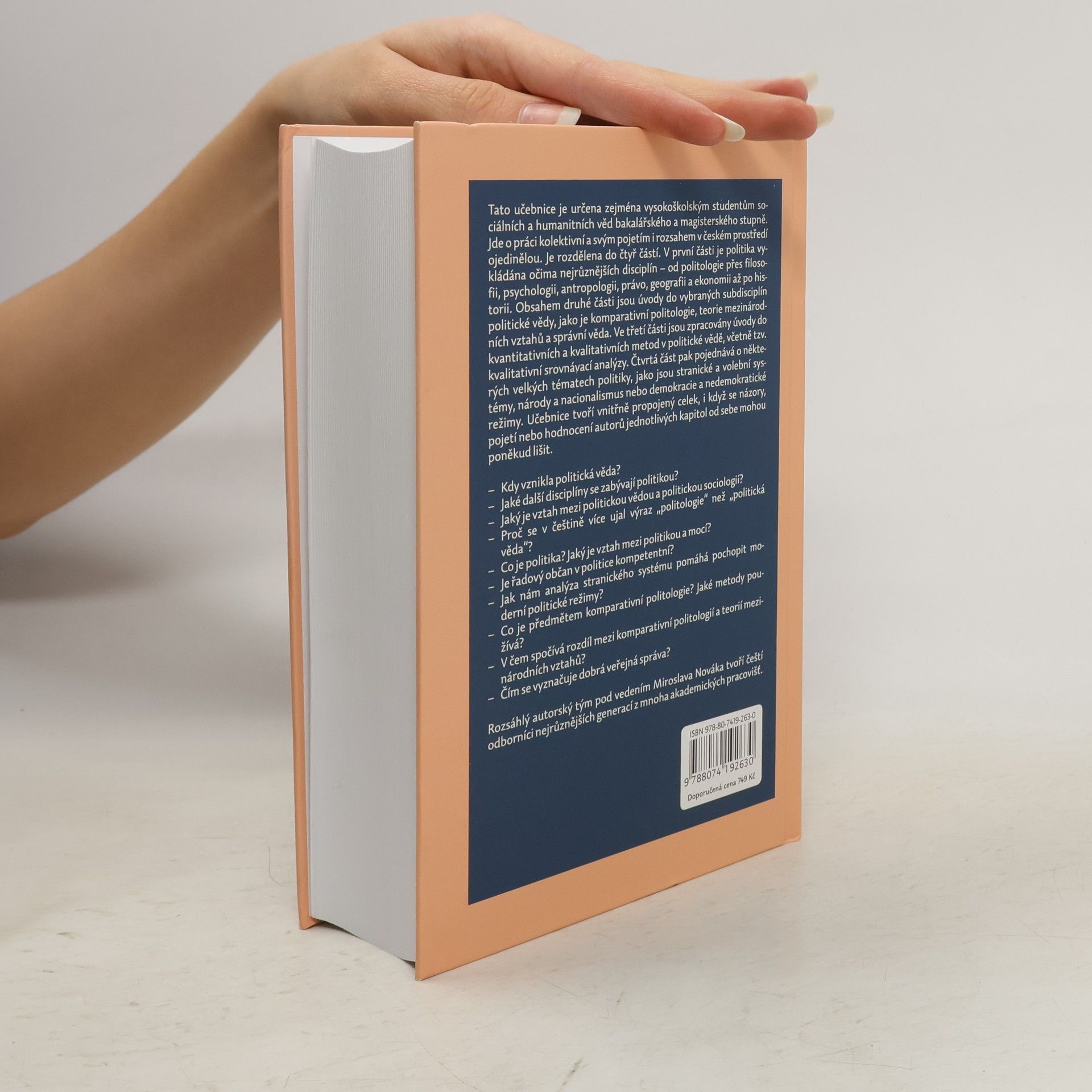 Tato učebnice je určena zejména vysokoškolským studentům sociálních a humanitních věd bakalářského a magisterského stupně. Jde o práci kolektivní a svým pojetím i rozsahem v českém prostředí ojedinělou. Je rozdělena do čtyř částí. V první části je politika vykládána očima nejrůznějších disciplín – od politologie přes filosofii, psychologii, antropologii, právo, geografii a ekonomii až po historii. Obsahem druhé části jsou úvody do vybraných subdisciplín politické vědy, jako je komparativní politologie, teorie mezinárodních vztahů a správní věda. Ve třetí části jsou zpracovány úvody do kvantitativních a kvalitativních metod v politické vědě, včetně tzv. kvalitativní srovnávací analýzy. Čtvrtá část pak pojednává o některých velkých tématech politiky, jako jsou stranické a volební systémy, národy a nacionalismus nebo demokracie a nedemokratické režimy. Učebnice tvoří vnitřně propojený celek, i když se názory, pojetí nebo hodnocení autorů jednotlivých kapitol od sebe mohou poněkud lišit. Autoři: Miroslav Novák (ed.), Lubomír Brokl, Petr Drulák, Pavol Frič, Martin Gregor, Dušan Hendrych, Miroslav Hroch, Hynek Jeřábek, Karel Kouba, Oldřich Krulík, Michal Kubát, Jan Kysela, Tomáš Lebeda, Milan Nakonečný, Martin Potůček, Petr Skalník, Marek Skovajsa. Druhé, doplněné a upravené vydání.