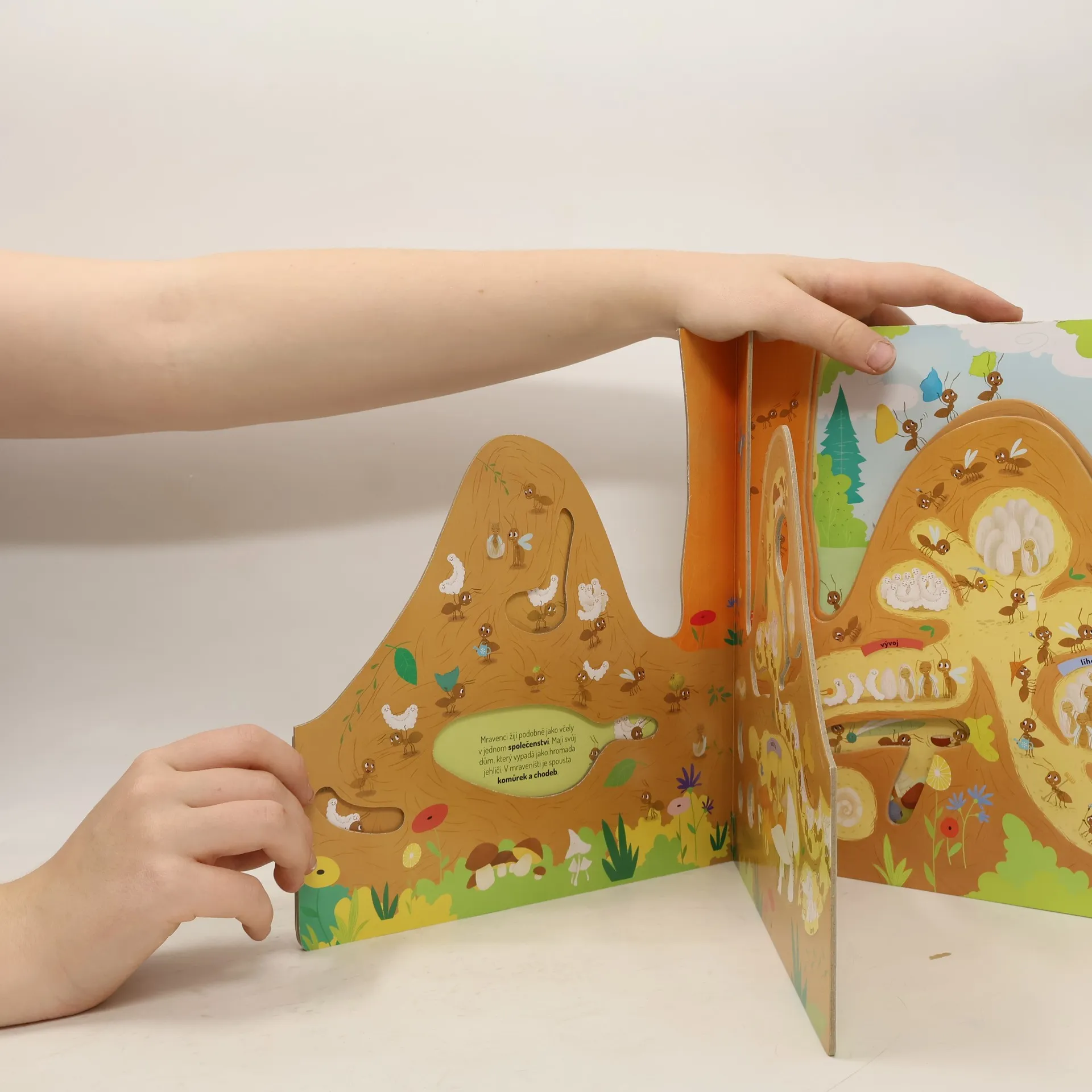Představ si, že jsi mravenec a strávíš jeden den v mraveništi. Jaké to asi bude? Celý den budeš pořád někam utíkat – uklízet a hloubit chodbičky, hledat různá semínka, abys měl co jíst, a až tě to přestane bavit, vylezeš si úplně nahoru na vršek mravenčí kupy, aby ses opaloval a nahříval si tělíčko. Ale dost už bylo řečí. Víš co? Udělej si pohodlí a pojď se s námi podívat přímo do mraveniště…
