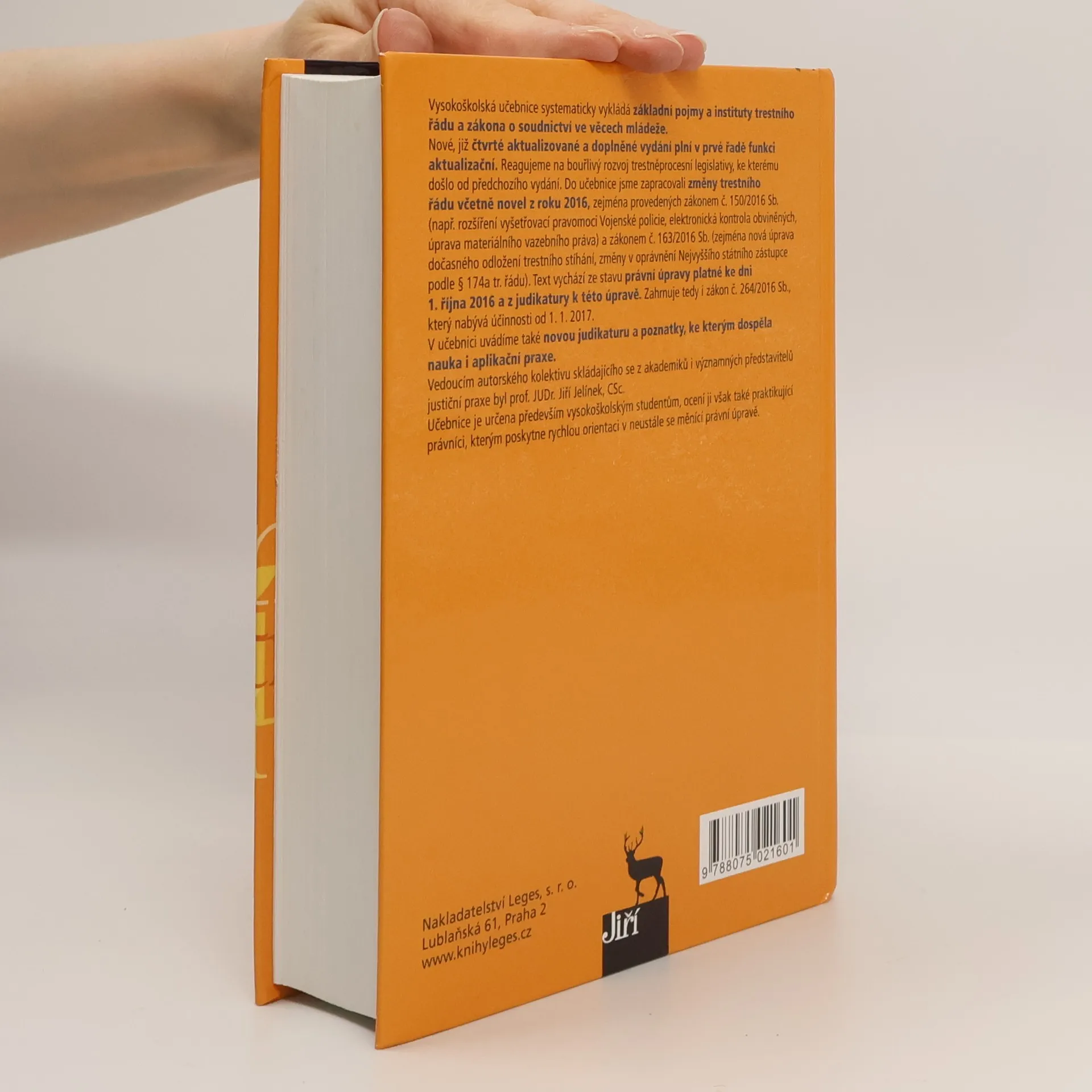 Vysokoškolská učebnice systematicky vykládá základní pojmy a instituty trestního řádu a zákona o soudnictví ve věcech mládeže. Nové, již čtvrté aktualizované a doplněné vydání plní v prvé řadě funkci aktualizační. Reagujeme na bouřlivý rozvoj trestněprocesní legislativy, ke kterému došlo od předchozího vydání. Do učebnice jsme zapracovali změny trestního řádu včetně novel z roku 2016, zejména provedených zákonem č. 150/2016 Sb. (např. rozšíření vyšetřovací pravomoci Vojenské policie, elektronická kontrola obviněných, úprava materiálního vazebního práva) a zákonem č. 163/2016 Sb. (zejména nová úprava dočasného odložení trestního stíhání, změny v oprávnění Nejvyššího státního zástupce podle § 174a tr. řádu). Text vychází ze stavu právní úpravy platné ke dni 1. října 2016 a z judikatury k této úpravě. Zahrnuje tedy i zákon č. 264/2016 Sb., který nabývá účinnosti od 1. 1. 2017. V učebnici uvádíme také novou judikaturu a poznatky, ke kterým dospěla nauka i aplikační praxe. Vedoucím autorského kolektivu skládajícího se z akademiků i významných představitelů justiční praxe byl prof. JUDr. Jiří Jelínek, CSc. Učebnice je určena především vysokoškolským studentům, ocení ji však také praktikující právníci, kterým poskytne rychlou orientaci v neustále se měnící právní úpravě.
