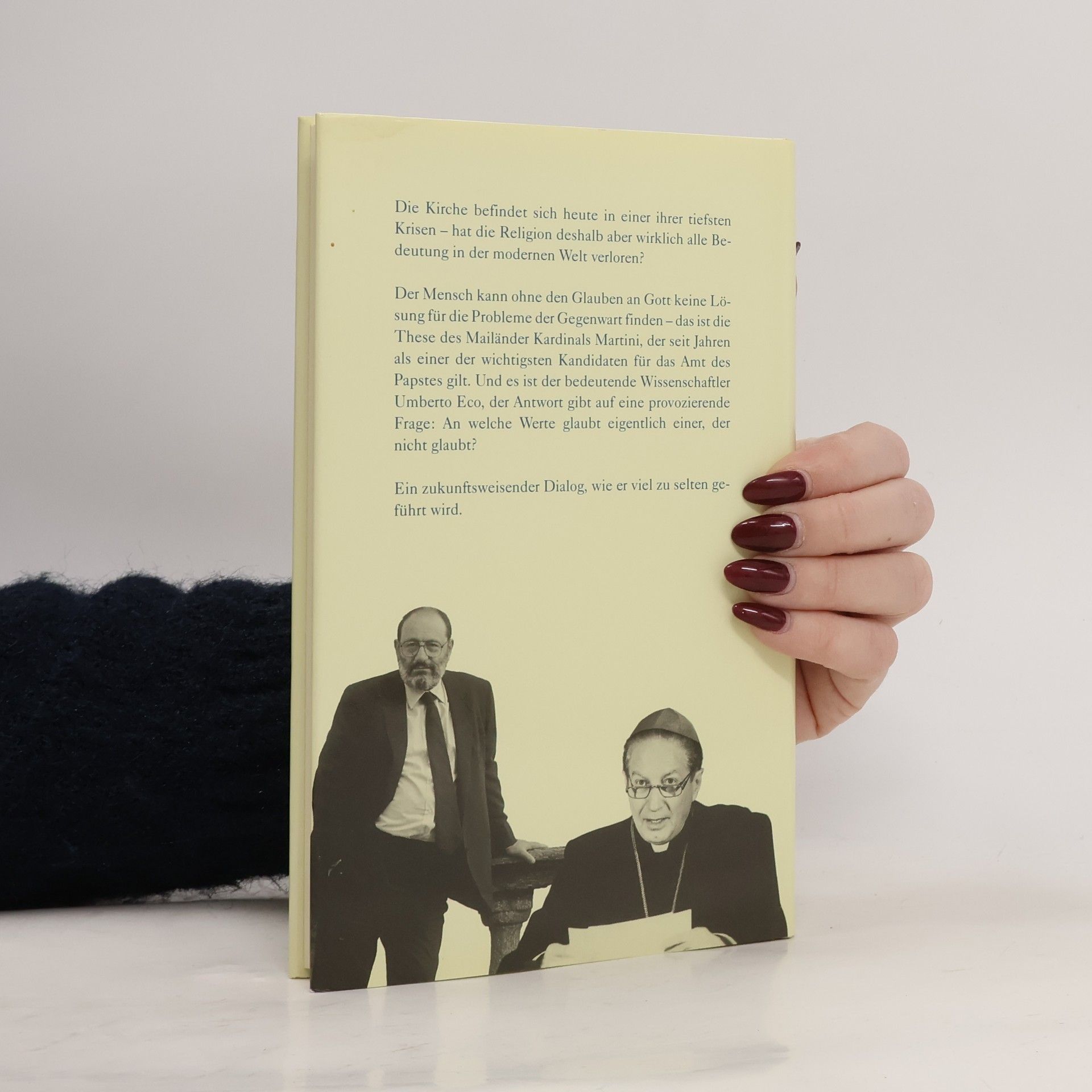 Hat die Kirche heute all ihre Glaubwürdigkeit verloren? Der Briefwechsel zwischen Carlo Martini, dem Mailänder Kardinal und aussichtsreichen Kandidaten für das Amt des Papstes, und Umberto Eco, dem klassischen Intellektuellen, ist das spannende Dokument eines Dialoges, wie er viel zu selten geführt wird. „Ein intelligenter Beitrag zur immer drängenderen Frage nach der Zukunft des Glaubens.“ (News)