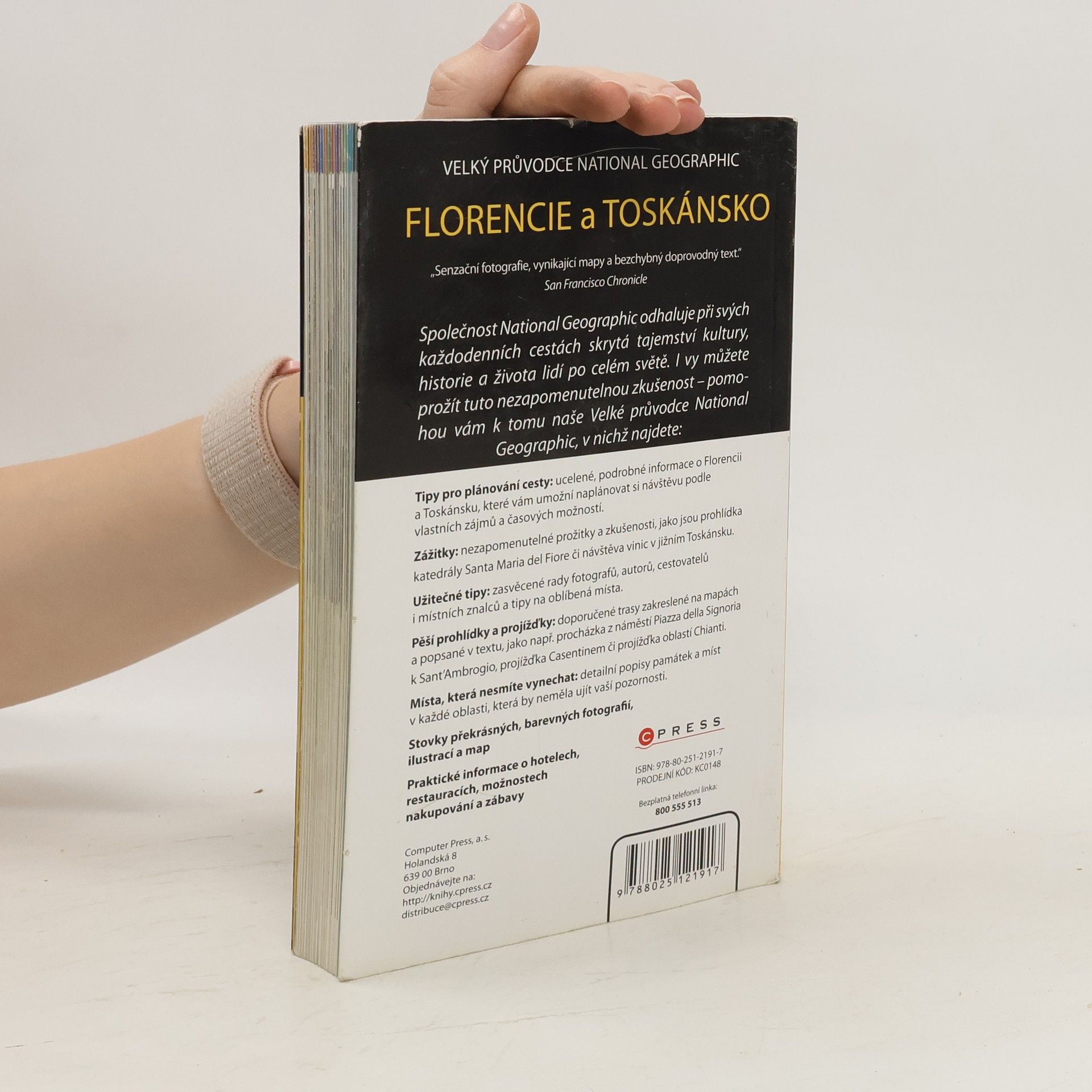 „Senzační fotografie, vynikající mapy a bezchybný doprovodný text.“ San Francisco Chronicle Společnost National Geographic odhaluje při svých každodenních cestách skrytá tajemství kultury, historie a života lidí po celém světě. I vy můžete prožít tuto nezapomenutelnou zkušenost – pomohou vám k tomu Velké průvodce National Geographic, v nichž najdete: - Tipy pro plánování cesty: ucelené, podrobné informace o Florencii a Toskánsku, které vám umožní naplánovat si návštěvu podle vlastních zájmů a časových možností. - Zážitky: nezapomenutelné prožitky a zkušenosti, jako jsou prohlídka katedrály Santa Maria del Fiore či návštěva vinic v jižním Toskánsku. - Užitečné tipy: zasvěcené rady fotografů, autorů, cestovatelů i místních znalců a tipy na oblíbená místa. - Pěší prohlídky a projížďky: doporučené trasy zakreslené na mapách a popsané v textu, jako např. procházka z náměstí Piazza della Signoria k Sant’Ambrogio, projížďka Casentinem či projížďka oblastí Chianti. - Místa, která nesmíte vynechat: detailní popisy památek a míst v každé oblasti, která by neměla ujít vaší pozornosti. Stovky překrásných, barevných fotografií, ilustrací a map. Praktické informace o hotelech, restauracích, možnostech nakupování a zábavy