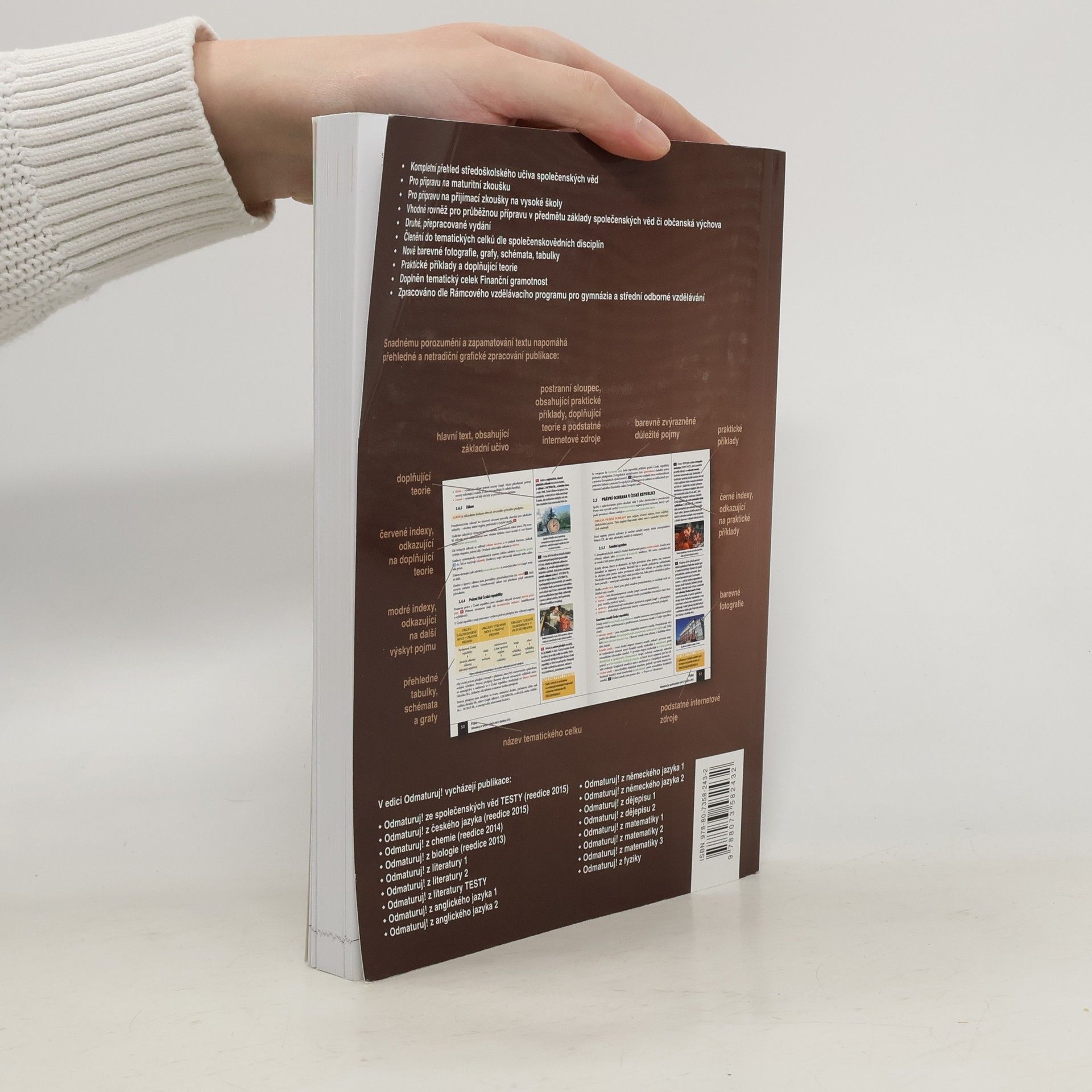 Nakladatelství DIDAKTIS připravuje nové vydání úspěšného titulu Odmaturuj! ze společenských věd z edice Odmaturuj! Edice Odmaturuj! je primárně určena na přípravu k maturitní zkoušce, a to především k maturitní zkoušce v části profilové, taktéž slouží k přípravě na přijímací zkoušky na vysoké školy s humanitním zaměřením. Titul Odmaturuj! ze společenských věd však v novém vydání doporučujeme také pro průběžnou přípravu v předmětu základy společenských věd či občanská výchova na středních školách. I když tituly z edice Odmaturuj! nejsou koncipovány jako učebnice, je do nich zařazeno z hlediska obsahové komplexnosti veškeré středoškolské učivo. Titul je zpracován dle RVP pro gymnázia a RVP pro střední odborné vzdělávání. Nové vydání bude aktualizované podle legislativy účinné k 1. 1. 2015, bude doplněno o nové teoretické poznatky v rámci jednotlivých vědních disciplín a o praktické příklady. Obsah knihy je členěn do následujících tematických celků: Politologie Právo Mezinárodní vztahy Ekonomie Sociologie Psychologie Filozofie Etika Logika a teorie vědy Religionistika Finanční gramotnost Po grafické stránce je důležitou změnou převedení titulu do barevného provedení na bílém podkladu, výklad je doplněn řadou schémat, tabulek a grafů. Nově byl přidán také odkazový aparát v rámci textu a odkazy na podstatné internetové zdroje.