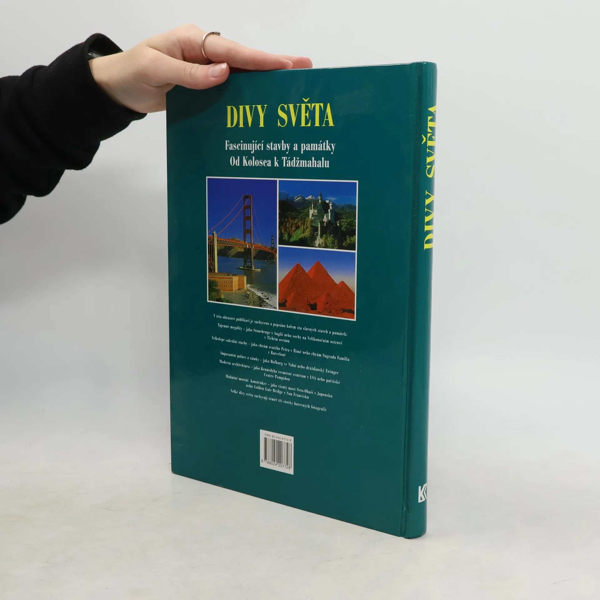 Tato obrazová publikace předvádí na stovku pozoruhodných a facsinujících staveb v rozmezí deseti tisíc let. Spektrum je široké, chrámy kostely, paláce a zámky, ale i ulice plné vody, přehrady, železnice a samozřejmě i věže a mrakodrapy našeho století. Publikace je rozdělena podle světadílů, stati udávají jednotlivé tematické okruhy jako například kostely skouží fundované historické informaci a usnadňuje přehled. Každé stabě je věnována jedna dvojstrana. Fascinující obrazy - kolem tři set dokonalých barevných fotografií - předvádějí velké divy tohoto světa.