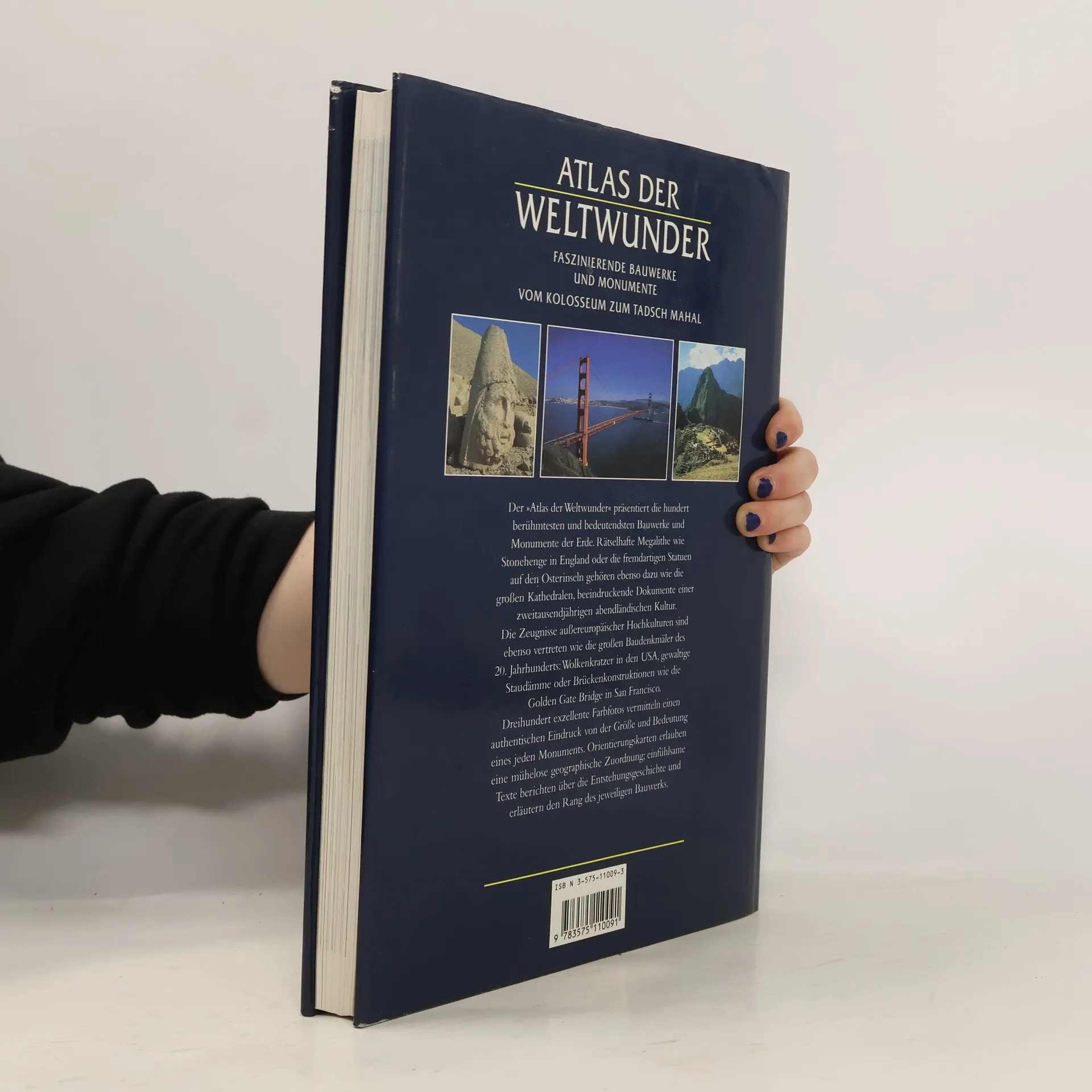 Der Atlas der Weltwunder präsentiert die hundert bedeutendsten Bauwerke und Monumente der Erde. Rätselhafte Megalithe wie Stonehenge in England oder die außergewöhnlichen Statuen auf den Osterinseln im Pazifik gehören ebenso dazu wie die großartigen Sakralbauten, die Peterskirche in Rom oder Gaudis 'Sagrada Familia' in Barcelona, beeindruckende Dokumente einer zweitausendjährigen abendländischen Kultur. Die Zeugnisse außereuropäischer Hochkulturen sind ebenso in diesem Buch zu bewundern wie die großen Baudenkmäler des 20. Jahrhunderts - Wolkenkratzer in New York, Staudämme oder Brückenkonstruktionen wie die Golden Gate Bridge in San Francisco. Die informativen Texte berichten über die Entstehungsgeschichte jedes einzelnen Bauwerkes.
