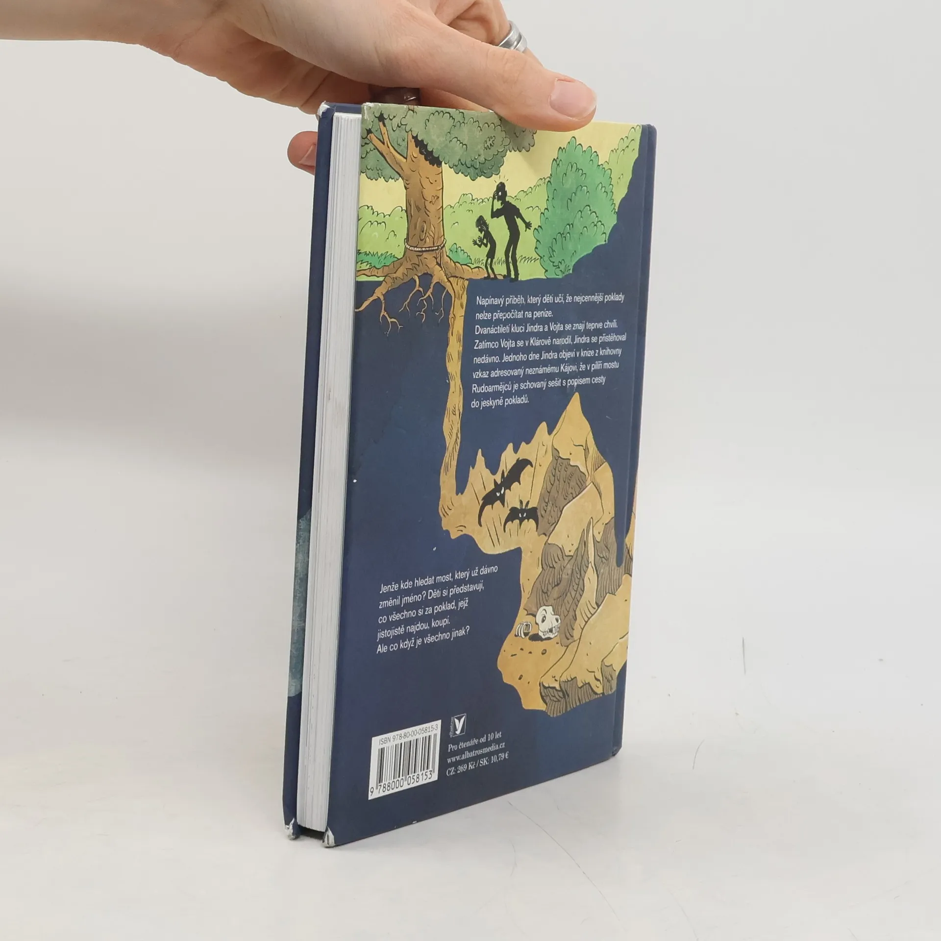 Dobrodružný příběh kamarádů, kteří pátrají po dávno zapomenutém pokladu. Vojta s Jindrou jsou přátelé na život a na smrt. Když spolu objeví tajemný vzkaz a najdou ukrytý sešit s popisem cesty do jeskyně pokladů, vydají se okamžitě najít ten záhadný poklad. Co si asi tak za něj koupí? Ale s pokladem je to trochu jinak... dvanáctiletí průzkumníci nakonec musí bojovat o holý život. Nakladatelská anotace. Kráceno.