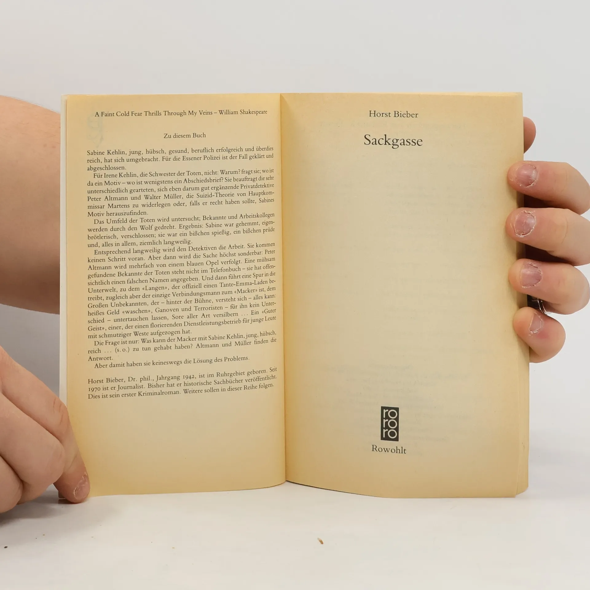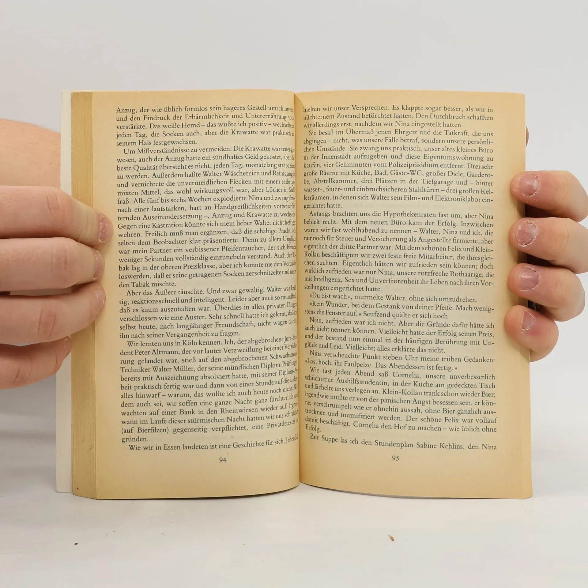 Sabine Kehlin, jung, hübsch, beruflich erfolgreich und überdies reich, hat sich umgebracht. Selbstmord - Für die Essener Polizei ist der Fall geklärt und abgeschlossen. Für Irene Kehlin, die Schwester der Toten, nicht: Warum?, fragt sie; wo ist da ein Motiv - wo ist wenigstens ein Abschiedsbrief? Sie beauftragt die sehr unterschiedlich gearteten, sich eben darum gut ergänzende Privatdetektive Peter Altmann und Walter Müller, die Suizid-Theorie von Hauptkommissar Martens zu widerlegen oder, falls er recht haben sollte, Sabines Motiv herauszufinden. Das Umfeld der Toten wird untersucht; Bekannte und Arbeitskollegen werden durch den Wolf gedreht. Ergebnis: Sabine war gehemmt, eigenbrötlerisch, verschlossen; sie war ein bisschen spießig, ein bisschen prüde und, alles in allem, ziemlich langweilig. Entsprechend langweilig wird den Detektiven die Arbeit. Sie kommen keinen Schritt voran. Aber dann wird die Sache höchst sonderbar: Peter Altmann wird mehrfach von einem blauen Opel verfolgt. Eine mühsam gefundene Bekannte der Toten steht nicht im Telefonbuch - sie hat offensichtlich einen falschen Namen angegeben. Und dann fuhrt eine Spur in die Unterwelt, zu dem «Langen», der offiziell einen Tante-Emma-Laden betreibt, zugleich aber der einzige Verbindungsmann zum «Macker» ist, dem Großen Unbekannten, der - hinter der Bühne, versteht sich - alles kann: heißes Geld «waschen», Ganoven und Terroristen - für ihn kein Unterschied - untertauchen lassen, Sore aller Art versilbern ... Ein «Guter Geist», einer, der einen florierenden Dienstleistungsbetrieb für junge Leute mit schmutziger Weste aufgezogen hat. Die Frage ist nur: Was kann der Macker mit Sabine Kehlin, jung, hübsch, reich ... zu tun gehabt haben? Altmann und Müller finden die Antwort. Aber damit haben sie keineswegs die Lösung des Problems gefunden - sondern nur weiteren Ärger!