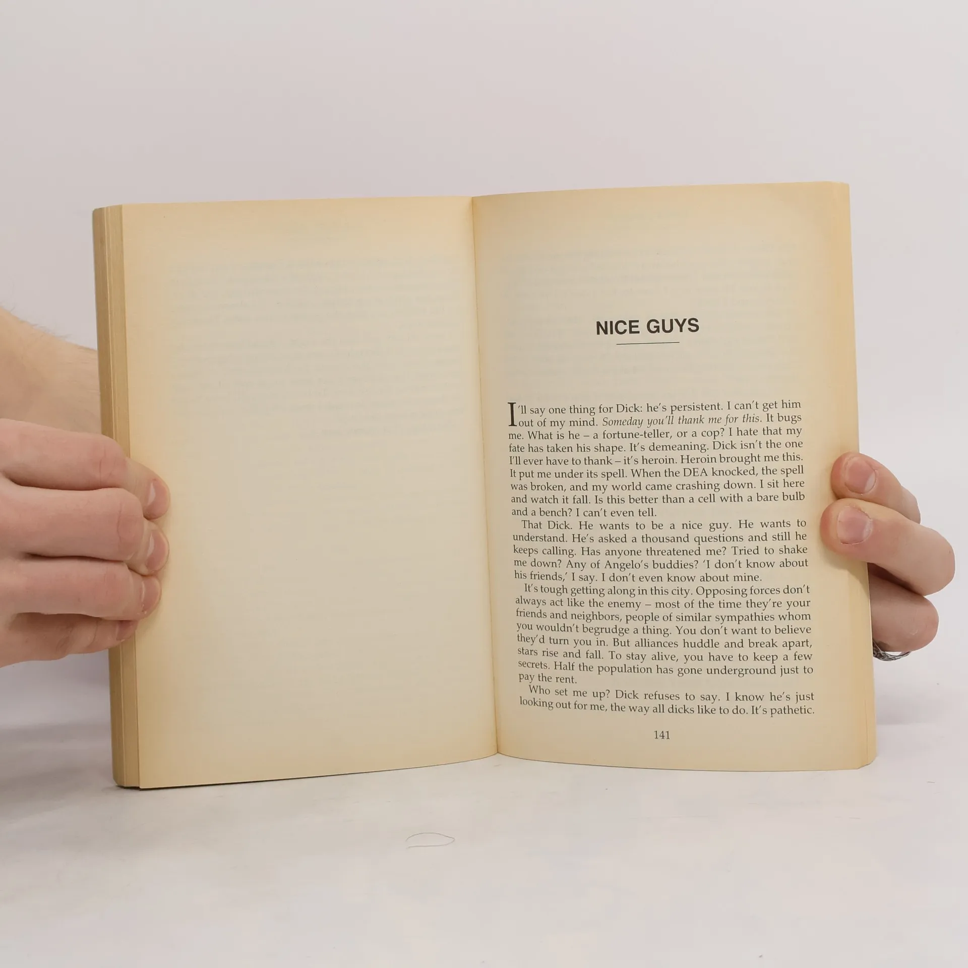 New York City. March 1986. The world is made of junk: junk bonds, junk food, junk powder. At least, that's how it seems to a woman in a downtown walkup, where every day for five years she's been opening her door to people engaged in the culture of the moment. Some of them are getting famous, some are changing their sex, while others are dying. But all of them are buying her heroin, and one of them is a rat: one morning she opens the door to a drug-enforcement agent - Dick.
