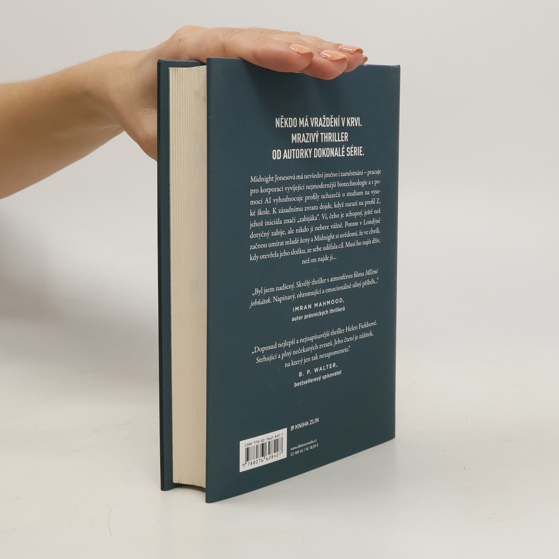 Někdo má vraždění v krvi. Mrazivý thriller od autorky Dokonalé série. Midnight Jonesová má nevšední jméno i zaměstnání – pracuje pro korporaci vyvíjející nejmodernější biotechnologie a s pomocí AI vyhodnocuje profily uchazečů o studium na vysoké škole. K zásadnímu zvratu dojde, když narazí na profil Z, jehož iniciála značí „zabijáka“. Ví, čeho je schopný, ještě než dotyčný zabije, ale nikdo ji nebere vážně. Potom v Londýně začnou umírat mladé ženy a Midnight si uvědomí, že ve chvíli, kdy otevřela jeho složku, ze sebe udělala cíl. Musí ho najít dřív, než on najde ji…