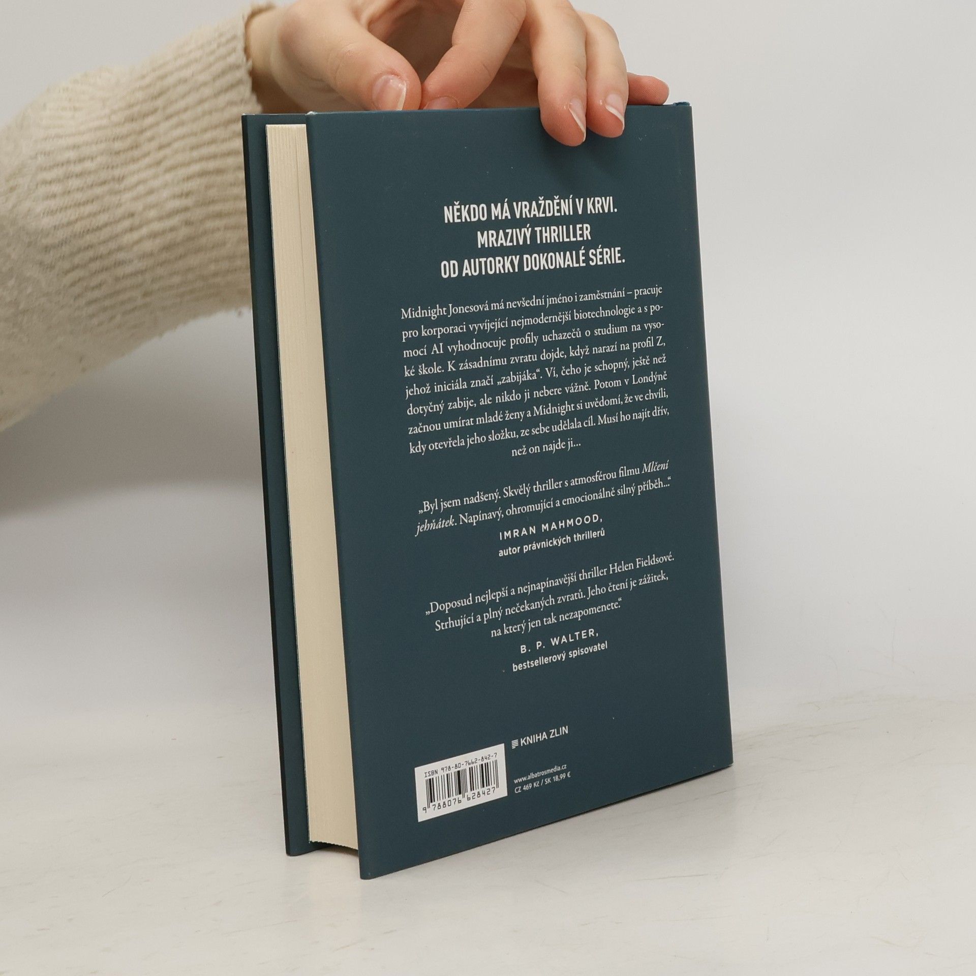Někdo má vraždění v krvi. Mrazivý thriller od autorky Dokonalé série. Midnight Jonesová má nevšední jméno i zaměstnání – pracuje pro korporaci vyvíjející nejmodernější biotechnologie a s pomocí AI vyhodnocuje profily uchazečů o studium na vysoké škole. K zásadnímu zvratu dojde, když narazí na profil Z, jehož iniciála značí „zabijáka“. Ví, čeho je schopný, ještě než dotyčný zabije, ale nikdo ji nebere vážně. Potom v Londýně začnou umírat mladé ženy a Midnight si uvědomí, že ve chvíli, kdy otevřela jeho složku, ze sebe udělala cíl. Musí ho najít dřív, než on najde ji…