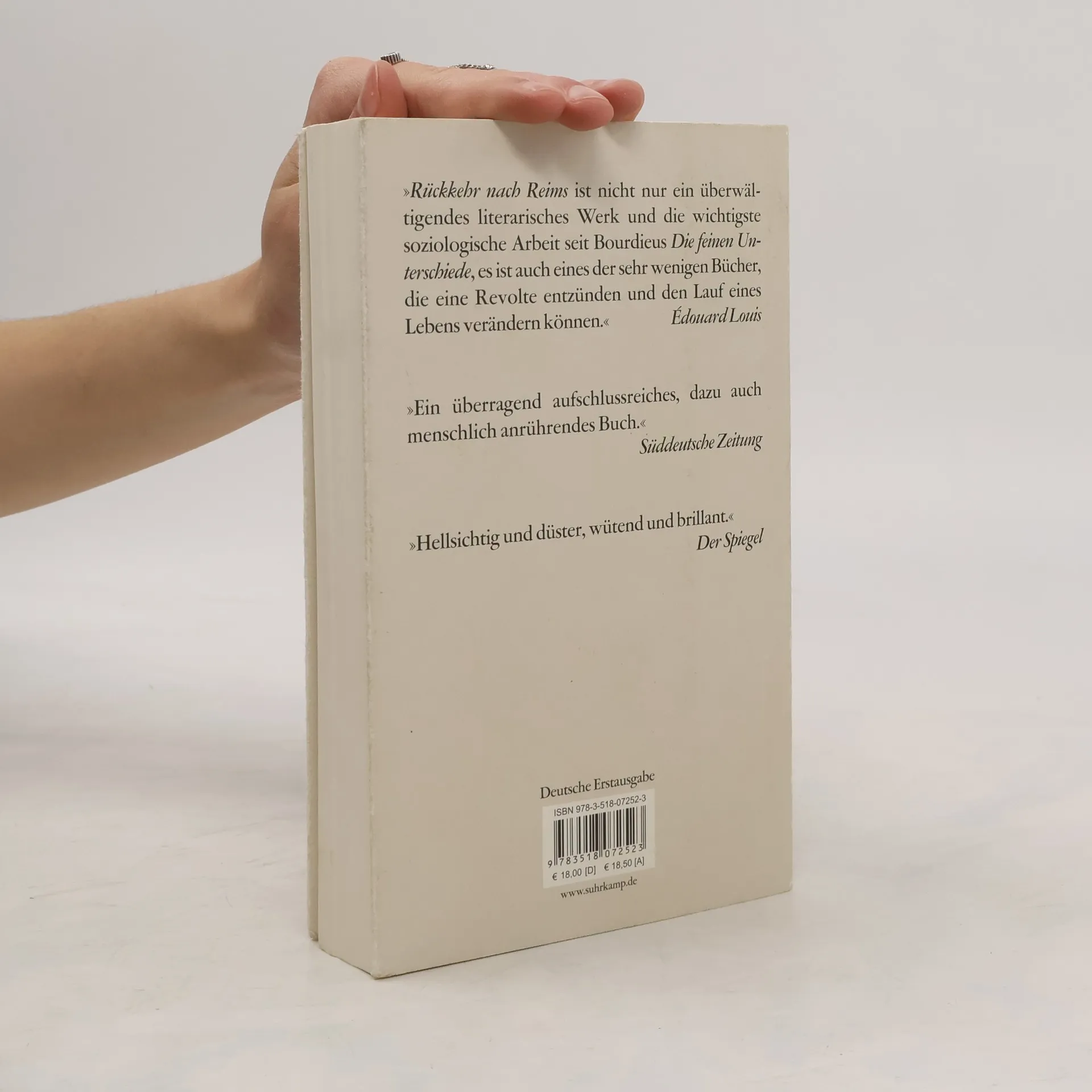 Als sein Vater stirbt, reist Didier Eribon zum ersten Mal nach Jahrzehnten in seine Heimatstadt. Gemeinsam mit seiner Mutter sieht er sich Fotos an – das ist die Ausgangskonstellation dieses Buchs, das autobiografisches Schreiben mit soziologischer Reflexion verknüpft. Eribon realisiert, wie sehr er unter der Homophobie seines Herkunftsmilieus litt und dass es der Habitus einer armen Arbeiterfamilie war, der es ihm schwer machte, in der Pariser Gesellschaft Fuß zu fassen. Darüber hinaus liefert er eine Analyse des sozialen und intellektuellen Lebens seit den fünfziger Jahren und fragt, warum ein Teil der Arbeiterschaft zum Front National übergelaufen ist. Das Buch sorgt seit seinem Erscheinen international für Aufsehen. So widmete Édouard Louis dem Autor seinen Bestseller »Das Ende von Eddy«.