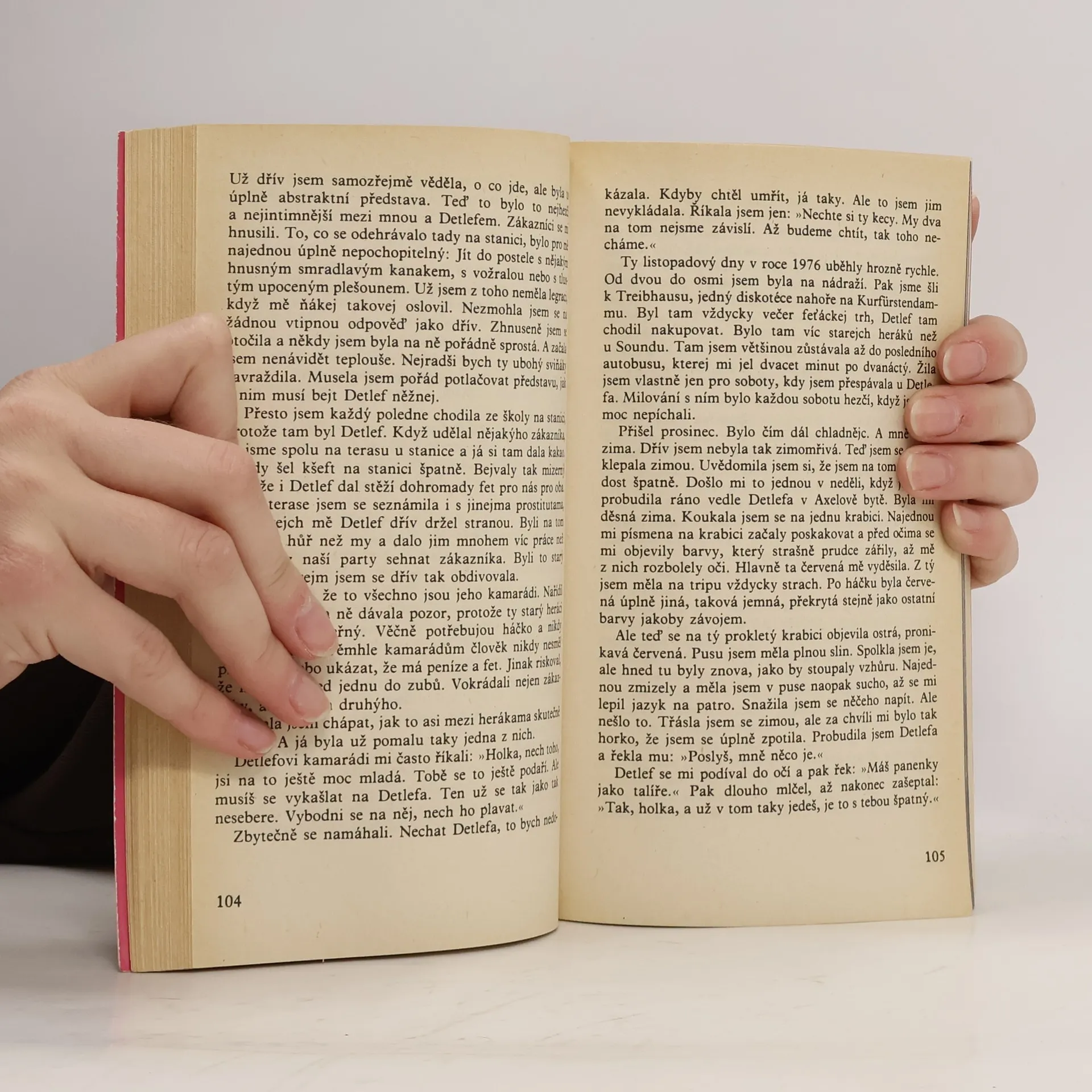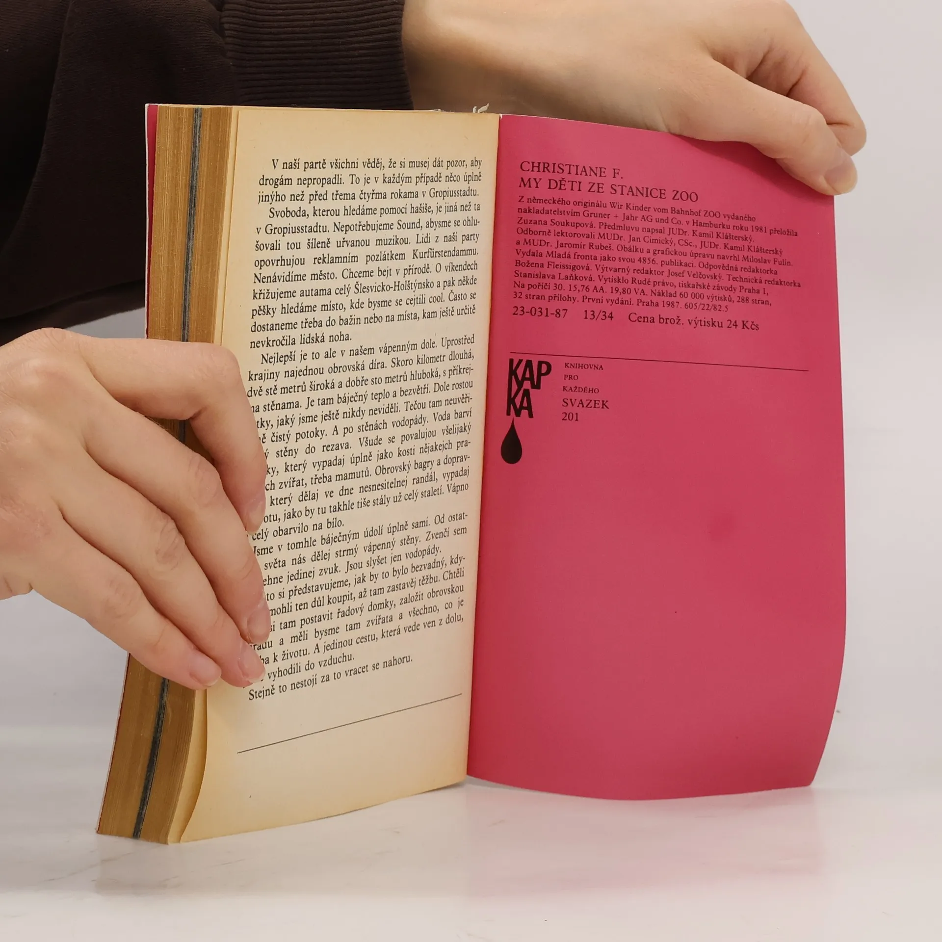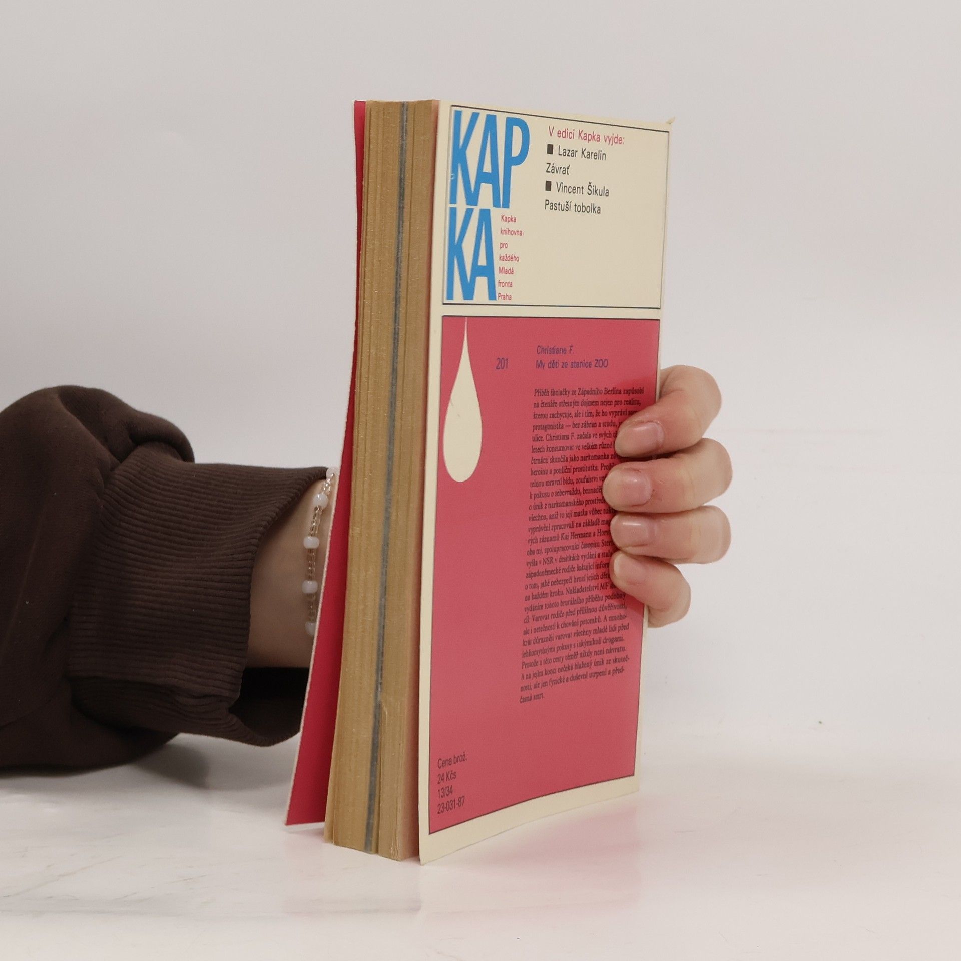 Mladistvá západoberlínská narkomanka ich-formou popisuje svůj příchod jako 6leté na berlínské sídliště Gropiusstadt s minimem možností zábavy pro děti. Neutěšené rodinné poměry vedoucí k rozvodu rodičů ji přivádí k hašišové partě v „Domě středu“. Následně postupně propadává světem drog až k těžké závislosti na heroinu a všemu, co s ní souvisí: těžké zhoršování zdravotního stavu, snaha opatřit si peníze na dávku (žebrání, krádeže, prostituce) a občasné zoufalé a neúspěšné pokusy zbavit se závislosti. Později se dívka závislosti na heroinu zbaví, ale pořád zůstává závislá na hašiši. Kniha obsahuje vlepenou 32 stránkovou fotografickou přílohu. Předmluvu napsal JUDr. Kamil Klášterský. Odborně lektorovali MUDr. Jan Cimický, CSc., JUDr. Kamil Klášterský a MUDr. Jaromír Rubeš. První vydání.