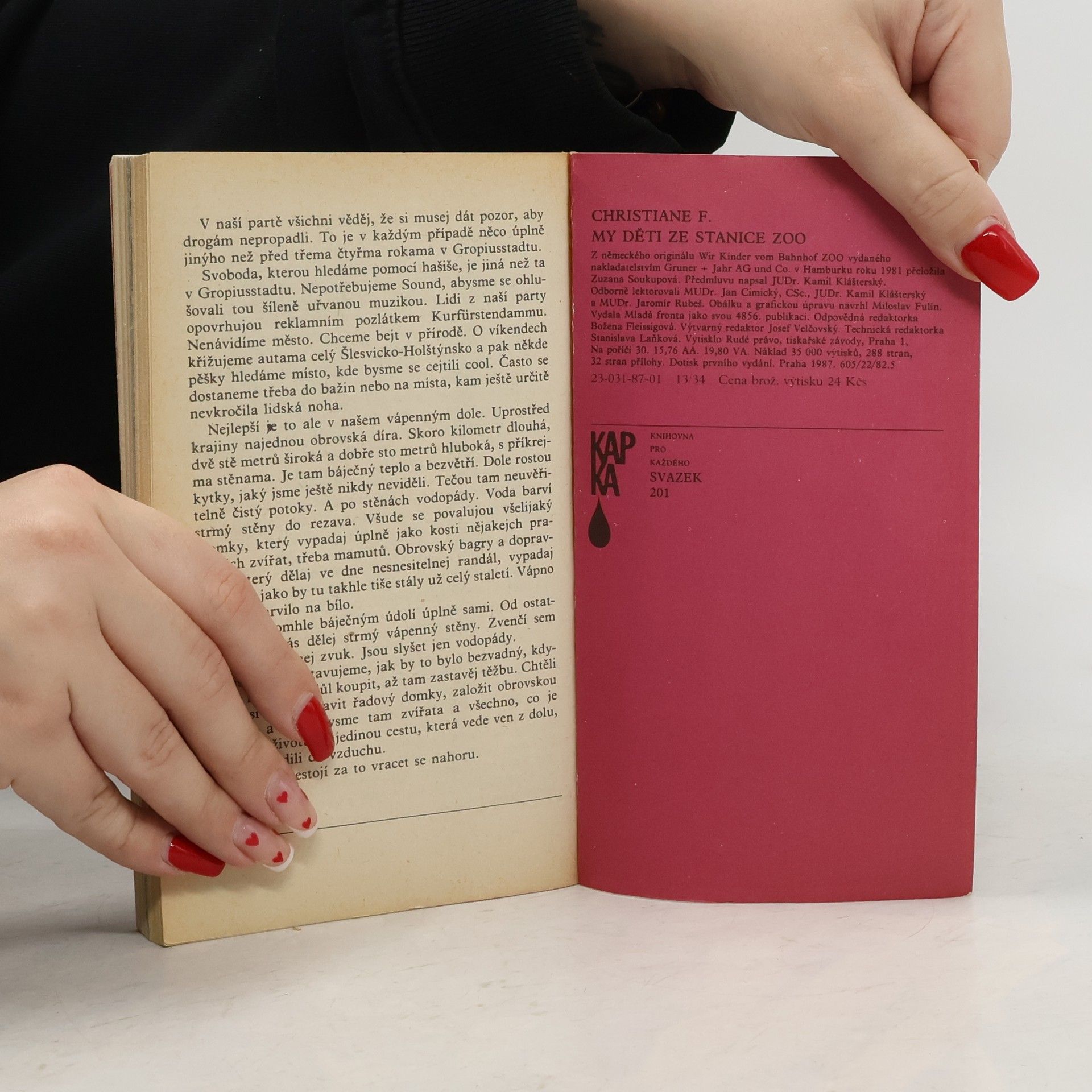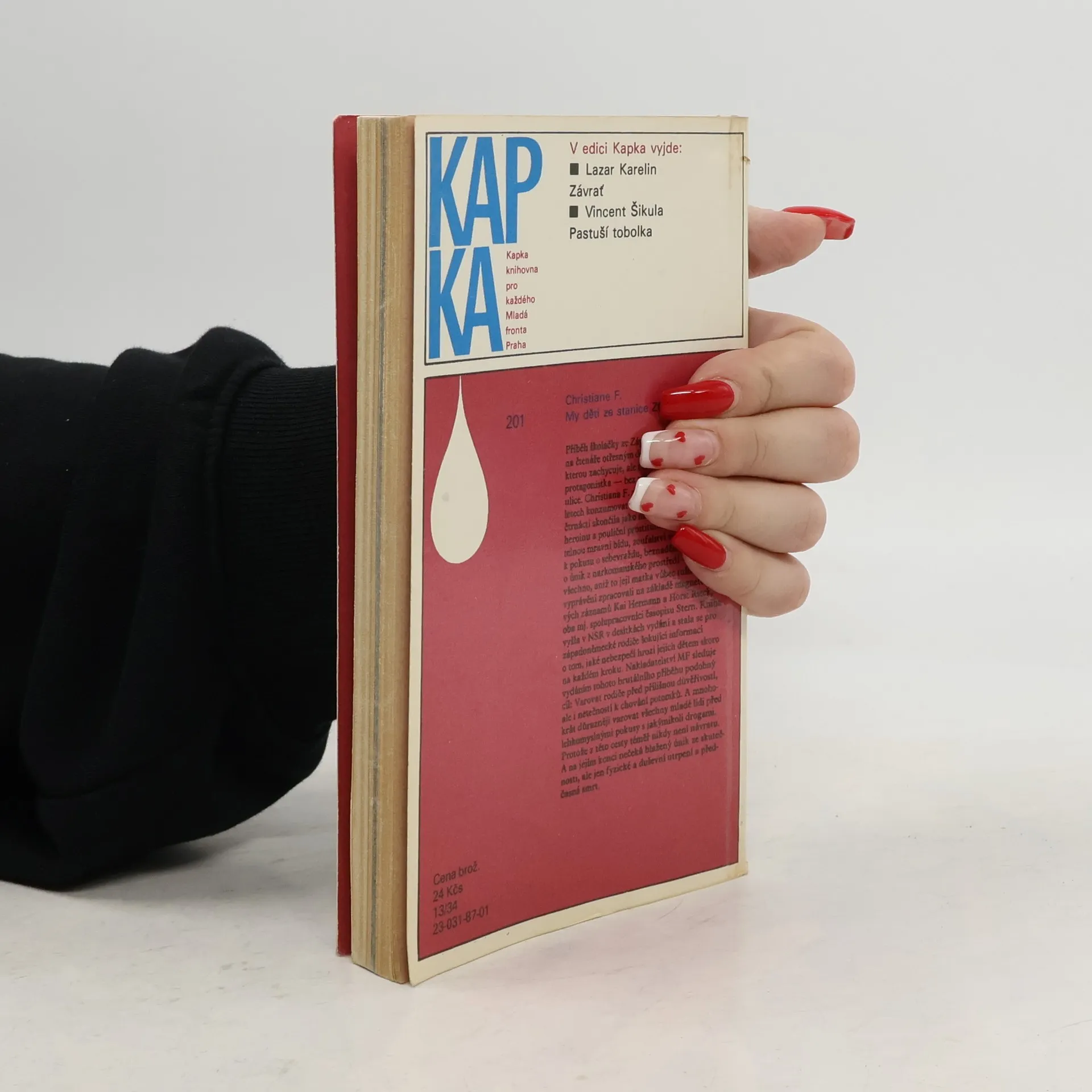 Mladistvá západoberlínská narkomanka ich-formou popisuje svůj příchod jako 6leté na berlínské sídliště Gropiusstadt s minimem možností zábavy pro děti. Neutěšené rodinné poměry vedoucí k rozvodu rodičů ji přivádí k hašišové partě v „Domě středu“. Následně postupně propadává světem drog až k těžké závislosti na heroinu a všemu, co s ní souvisí: těžké zhoršování zdravotního stavu, snaha opatřit si peníze na dávku (žebrání, krádeže, prostituce) a občasné zoufalé a neúspěšné pokusy zbavit se závislosti. Později se dívka závislosti na heroinu zbaví, ale pořád zůstává závislá na hašiši. Kniha obsahuje vlepenou 32 stránkovou fotografickou přílohu. Předmluvu napsal JUDr. Kamil Klášterský. Odborně lektorovali MUDr. Jan Cimický, CSc., JUDr. Kamil Klášterský a MUDr. Jaromír Rubeš. První vydání.