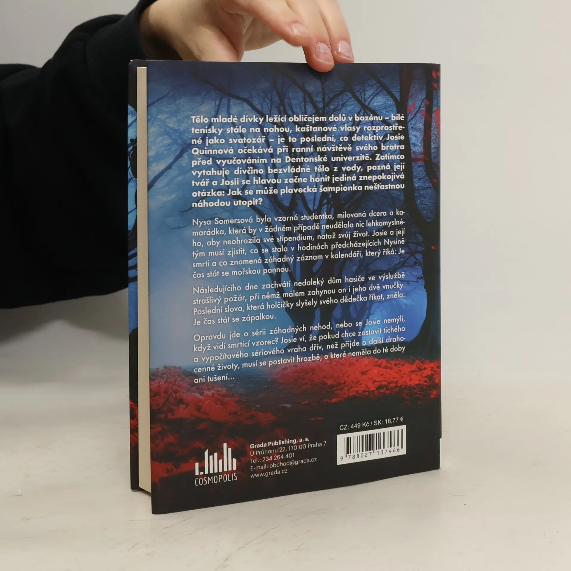 Tělo mladé dívky ležící obličejem dolů v bazénu je to poslední, co detektiv Josie Quinnová očekává při ranní návštěvě svého bratra na Dentonské univerzitě. Když však pozná dívčinu tvář, honí se Josii hlavou jediná otázka: Jak se může plavecká šampionka nešťastnou náhodou utopit? Následujícího dne zachvátí nedaleký dům hasiče ve výslužbě strašlivý požár, při němž málem zahyne on i jeho dvě vnučky. Opravdu jde o sérii záhadných úmrtí, nebo se Josie nemýlí, když vidí smrtící vzorec?