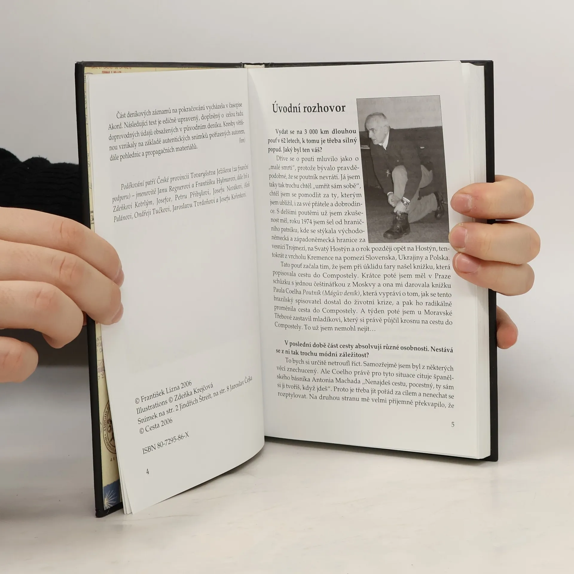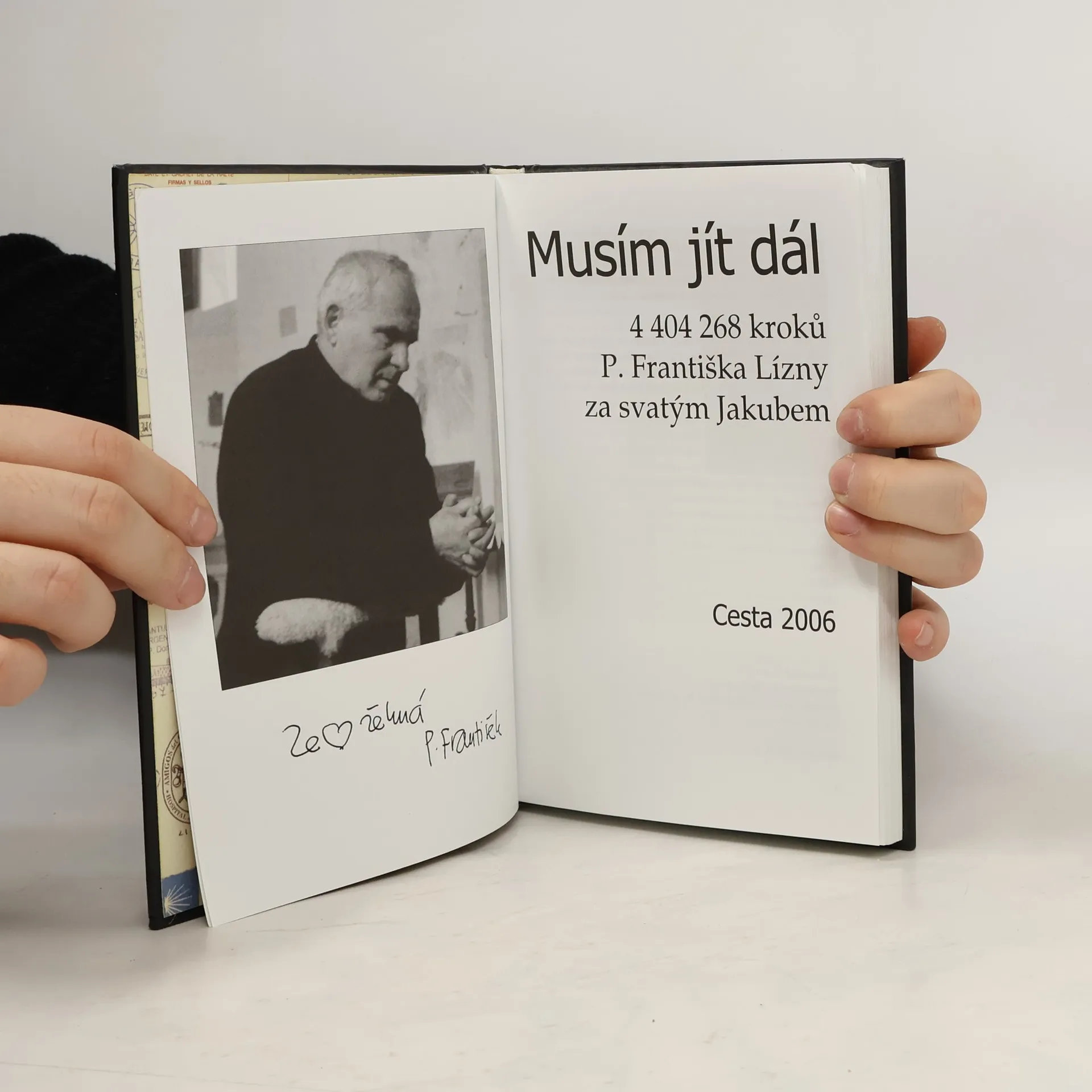 4 404 268 kroků P. Františka Lízny za svatým Jakubem. Kniha je autentickým souhrnem deníkových záznamů známého českého jezuity, který se věnuje zejména péči o lidi na okraji společnosti (vězňové, Romové, bezdomovci). Teologicko-filozofickými rozbory nezatížený text vypovídá nejen opouti, kterou 62letý František Lízna absolvoval v dubnu srpnu 2004, ale hlavně o jeho vidění světa. V knize nechybějí situace, v nichž se tento kněz při zápasu sama se sebou dostává do situace těch, o které se většinu svého života staral a na které formou „modlitebního losování“ nezapomíná ani při této cestě. Prostý neliterární styl autora, s kterým koresponduje i výtvarný doprovod knihy, umožňuje snadnou orientaci v textu i člověku, který se nepohybuje v církevním prostředí. Deník je doplněn řadou cenných dokumentů – fotografií, kopií původního deníku, poutnickou knížkou, dopisem Václavu Havlovi, pozdravem od současného prezidenta Václava Klause. Ukázky textu vycházely v časopise Akord.