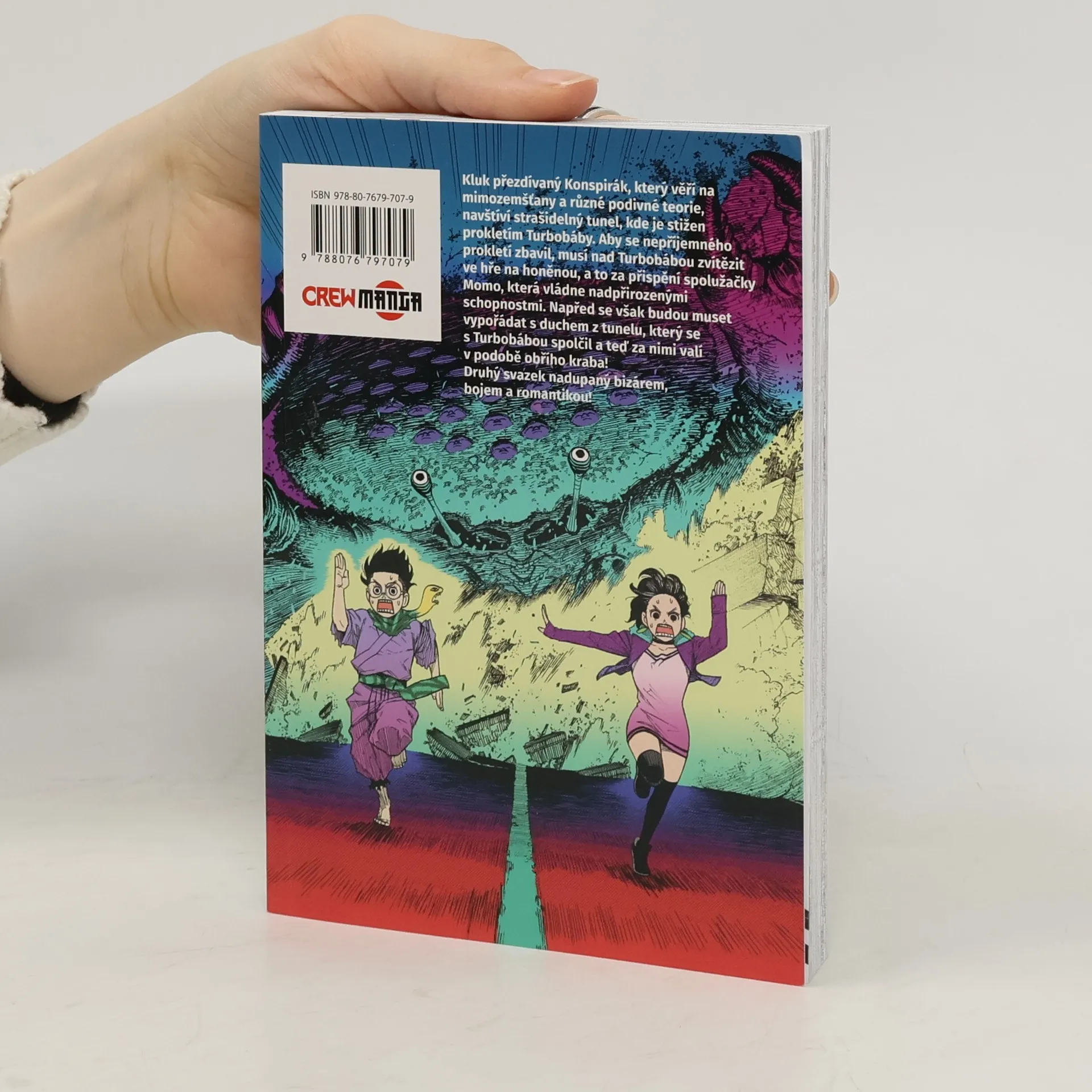 Kluk přezdívaný Konspirák, který věří na mimozemšťany a různé podivné teorie, navštíví strašidelný tunel, kde je stižen prokletím Turbobáby. Aby se nepříjemného prokletí zbavil, musí nad Turbobábou zvítězit ve hře na honěnou, a to za přispění spolužačky Momo, která vládne nadpřirozenými schopnostmi. Napřed se však budou muset vypořádat s duchem z tunelu, který se s Turbobábou spolčil a teď za nimi valí v podobě obřího kraba! Druhý svazek nadupaný bizárem, bojem a romantikou!