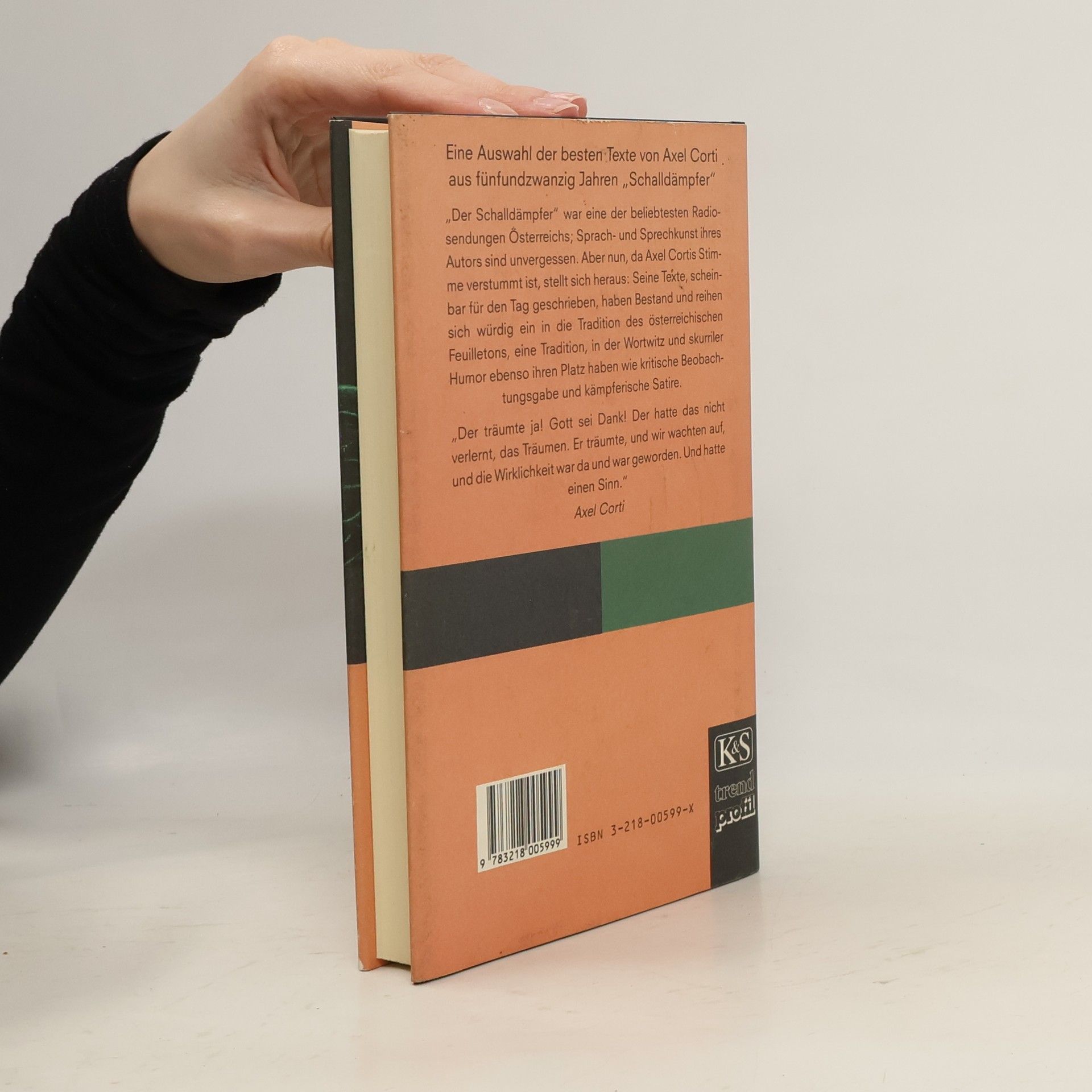 „Der Schalldämpfer“ war eine der beliebtesten Radiosendungen Österreichs, und die Sprach- und Sprechkunst ihres Autors bleibt unvergessen. Nach dem Verstummen von Axel Cortis Stimme zeigt sich, dass seine Texte, die scheinbar für den Tag geschrieben wurden, zeitlos sind und sich würdig in die Tradition des österreichischen Feuilletons einfügen. Diese Tradition vereint Wortwitz, skurrilen Humor, kritische Beobachtungsgabe und kämpferische Satire. Die Auswahl umfasst die besten Texte von Axel Corti aus den Jahren 1973-1990. Zu den Inhalten gehören unter anderem „Das gelbe Zimmer“, „Die sehr geehrten Herumgeher“, „Eine süsse Qual“, „Heute ist der Drehtag mit der Blondine“, „Fritz Kortner ist tot“ und „Was nicht im Polizeibericht stand“. Weitere bemerkenswerte Titel sind „Die Dame ist aus Plastik“, „Der Besserwisser“, „Wunder in Rot und Rund“ sowie „Das Telephon ist eine indiskrete Maschin'“. Cortis Texte bieten einen facettenreichen Einblick in menschliche Erfahrungen und gesellschaftliche Themen, die auch heute noch relevant sind. Sie laden den Leser ein, über die Absurditäten des Lebens nachzudenken und die Welt mit einem scharfen, humorvollen Blick zu betrachten.