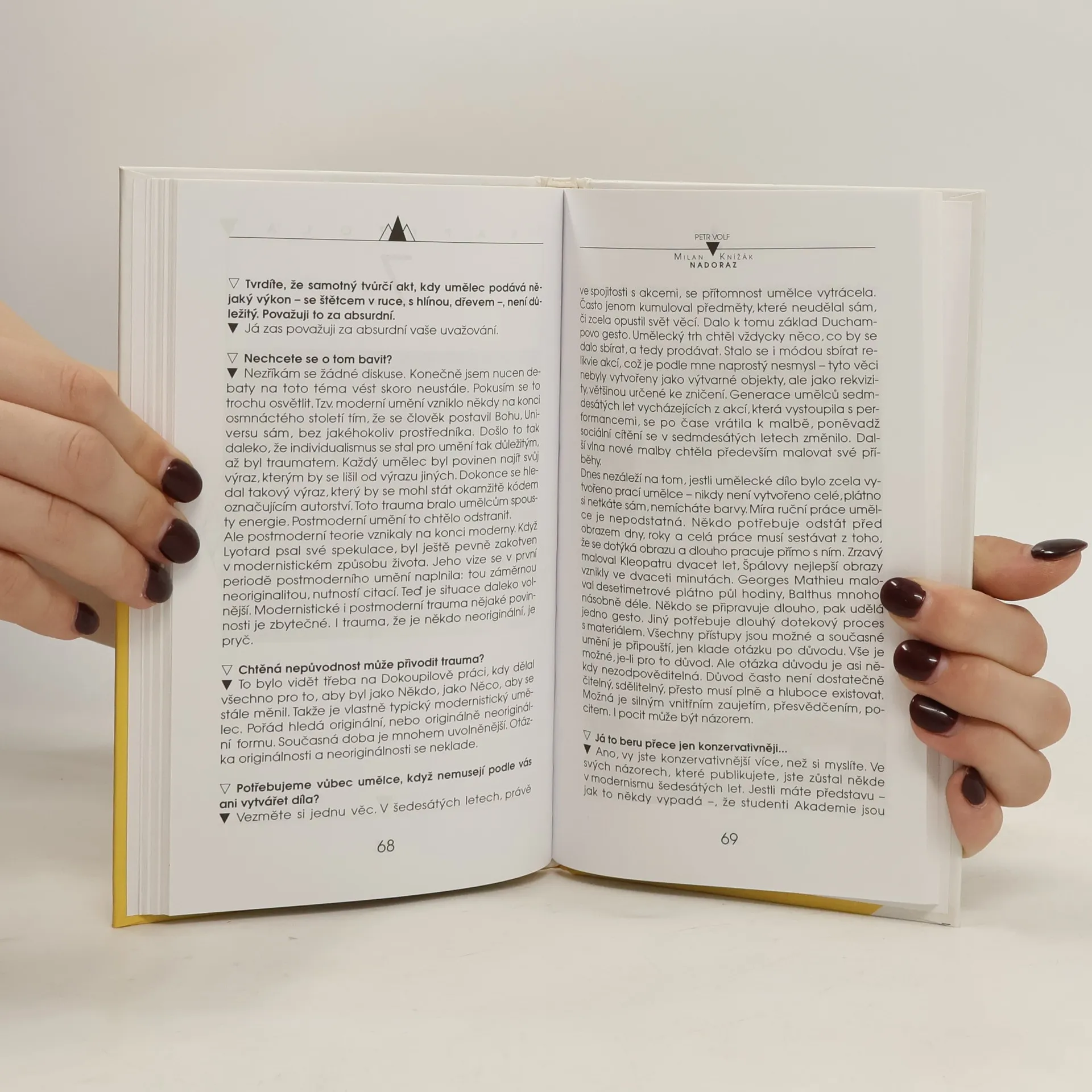 Osobní i obecné otázky novináře Volfa a otevřené, ostře a jasně formulované odpovědi Milana Knížáka. Vyhraněné postoje a názory, které se dotýkají mnohem širších nežli jen umění vymezených oblastí, odkrývají racionální i emotivní stránku umělcova myšlení, mapují jeho životní příběh, jeho vnímání a akceptování umění, jeho schopnost vyvolat diskusi a vyjadřovat se k věcem. Pevné a jasné stanovisko k jakémukoli tématu dokáže zaujmout.... celý text