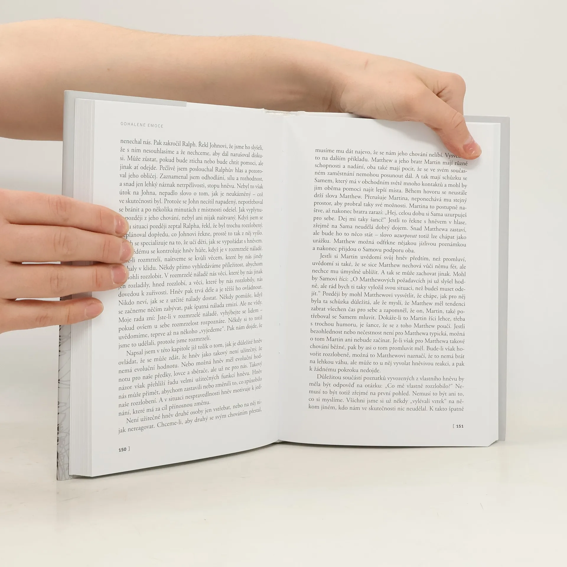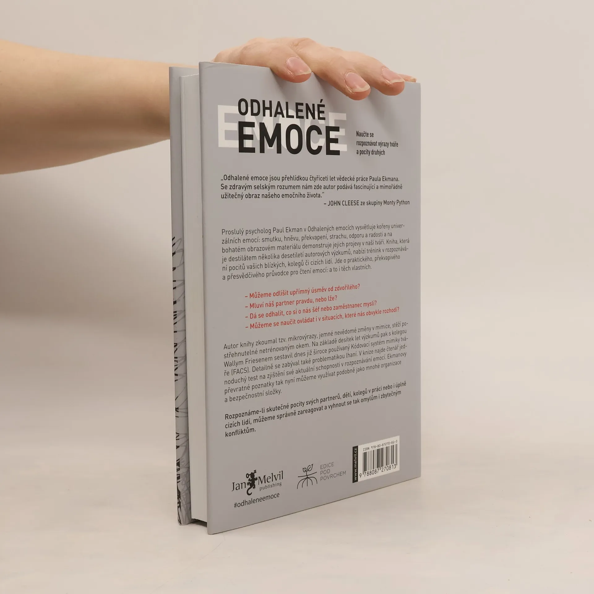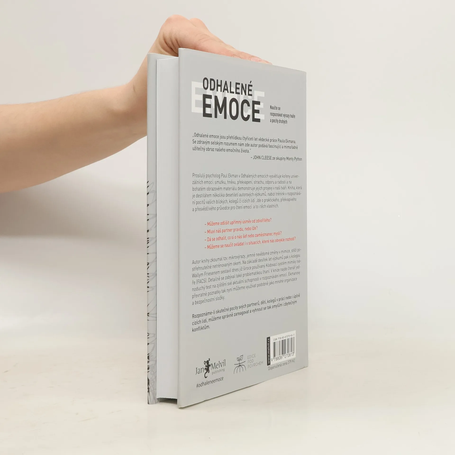 Proslulý psycholog Paul Ekman v Odhalených emocích vysvětluje kořeny univerzálních emocí: smutku, hněvu, překvapení, strachu, odporu a radosti a na bohatém obrazovém materiálu demonstruje jejich projevy v naší tváři. Kniha, která je destilátem několika desetiletí autorových výzkumů, nabízí trénink v rozpoznávání pocitů vašich blízkych, kolegů či cizích lidí. Jde o praktického, překvapivého a přesvědčivého průvodce pro čtení emocí: a to i těch vlastních. Rozpoznáme-li skutečné pocity svých partnerů, dětí, kolegů v práci nebo i úplně cizích lidí, můžeme správně zareagovat a vyhnout se tak omylům i zbytečným konfliktům.