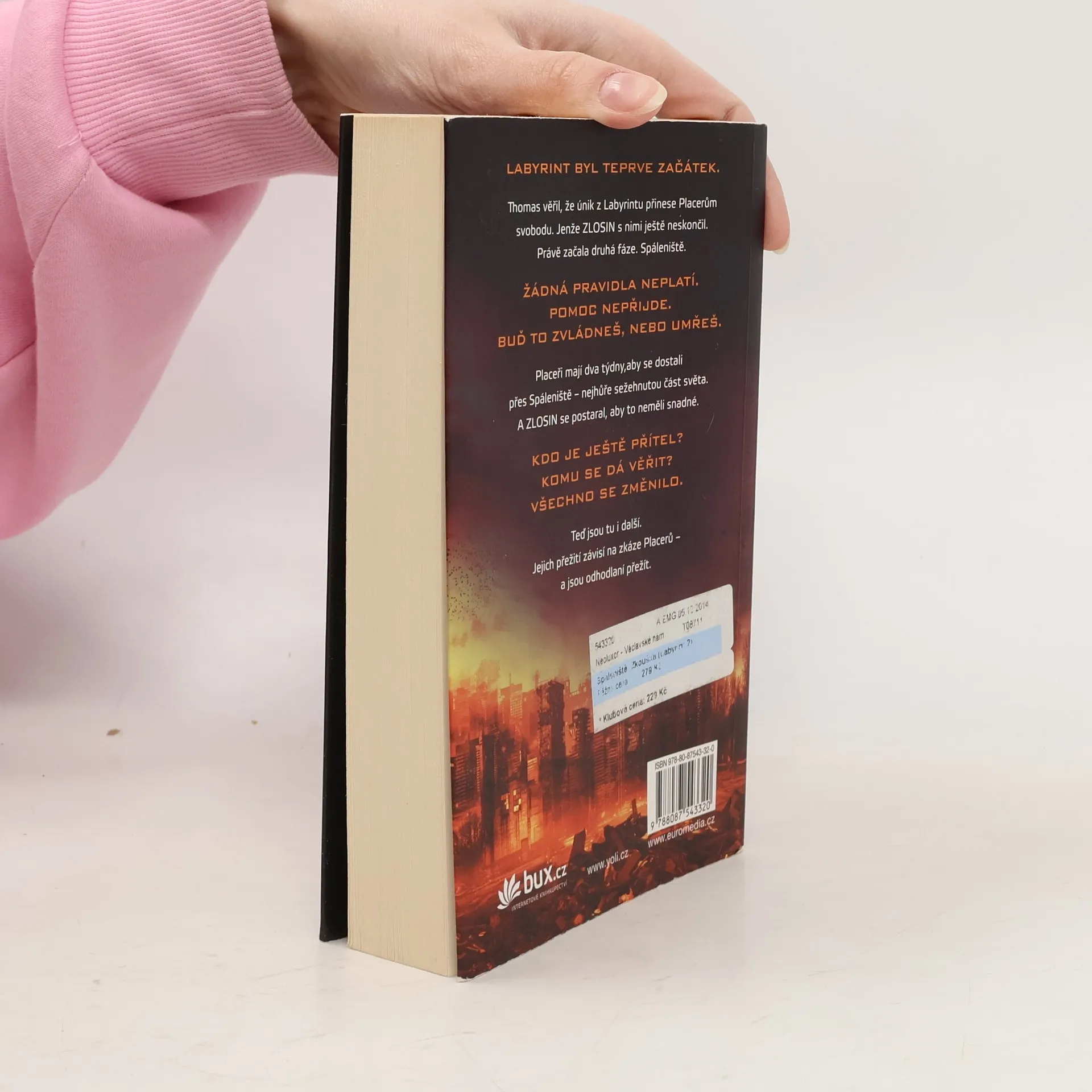 Labyrint byl teprve začátek. Nalezením cesty z labyrintu to mělo skončit... Už žádné hlavolamy. Žádné proměnné. A žádné běhání. Thomas byl přesvědčený, že když se jim podařilo uniknout, vrátí se on i Placeři ke svým dřívějším životům. Nikdo však ve skutečnosti netušil, do jakého života se vracejí. Země, sežehnutá slunečními erupcemi a spálená novým, krutým klimatem, se změnila v pustinu. Vláda se zhroutila – a s ní i pořádek. Rozpadajícími se městy teď bloudí „raplové“, lidé pokrytí hnisavými ranami, které infekční nemoc nazývaná erupce dohání k vražednému šílenství. Hledají, kde by našli další oběť... a potravu. Pro Placery běhání zdaleka neskončilo. Namísto svobody zjišťují, že mají před sebou další zkoušku. Musejí překonat Spáleniště, nejvíc sežehnutou část planety, a do dvou týdnů dorazit do bezpečného útočiště. A organizace ZLOSIN se postarala o to, aby uzpůsobila proměnné a nastavila šance v jejich neprospěch. Thomase čeká zkouška ohněm – skutečně přechovává někde v hlavě tajemství svobody? Nebo bude věčně vydán ZLOSINu na milost?