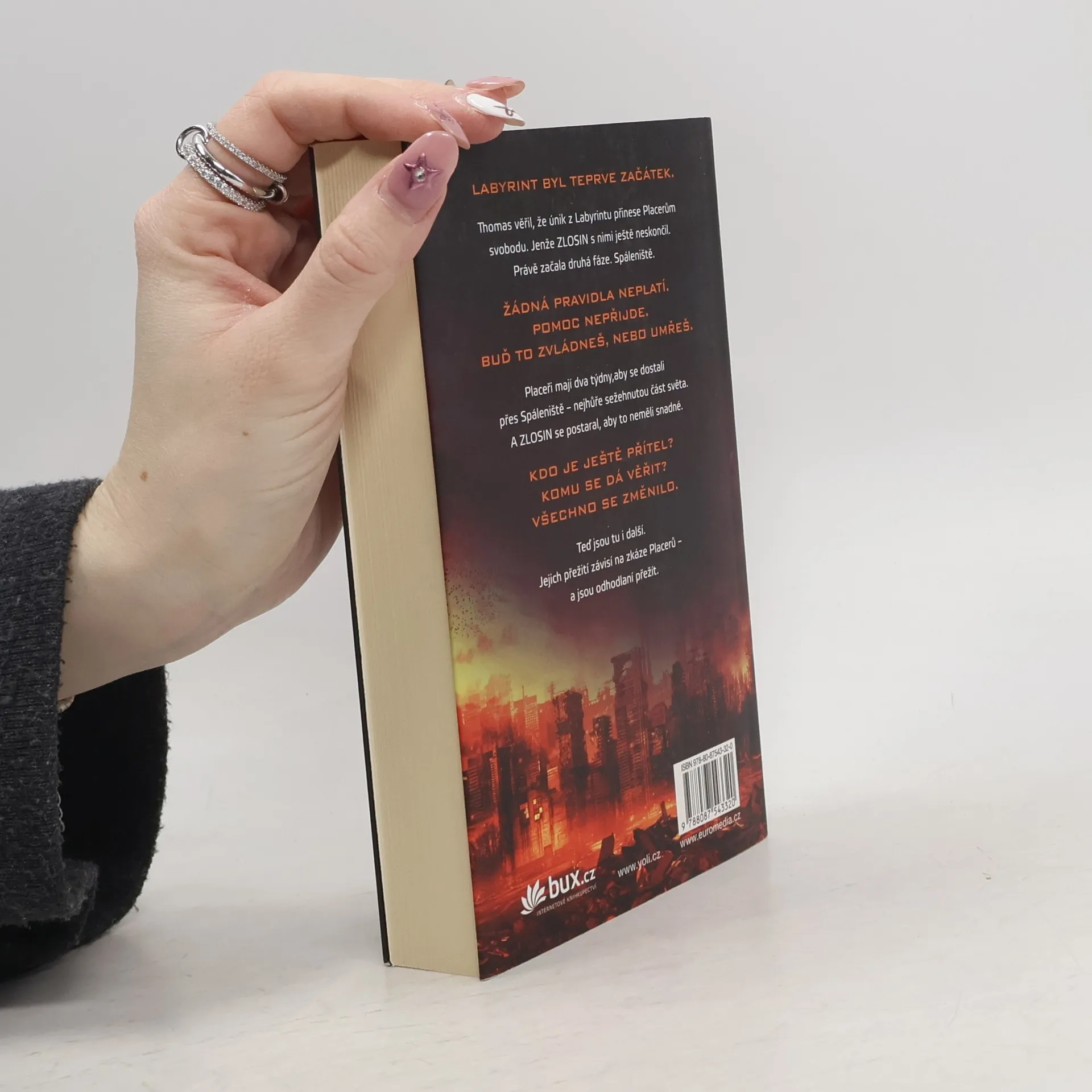 Labyrint byl teprve začátek. Nalezením cesty z labyrintu to mělo skončit... Už žádné hlavolamy. Žádné proměnné. A žádné běhání. Thomas byl přesvědčený, že když se jim podařilo uniknout, vrátí se on i Placeři ke svým dřívějším životům. Nikdo však ve skutečnosti netušil, do jakého života se vracejí. Země, sežehnutá slunečními erupcemi a spálená novým, krutým klimatem, se změnila v pustinu. Vláda se zhroutila – a s ní i pořádek. Rozpadajícími se městy teď bloudí „raplové“, lidé pokrytí hnisavými ranami, které infekční nemoc nazývaná erupce dohání k vražednému šílenství. Hledají, kde by našli další oběť... a potravu. Pro Placery běhání zdaleka neskončilo. Namísto svobody zjišťují, že mají před sebou další zkoušku. Musejí překonat Spáleniště, nejvíc sežehnutou část planety, a do dvou týdnů dorazit do bezpečného útočiště. A organizace ZLOSIN se postarala o to, aby uzpůsobila proměnné a nastavila šance v jejich neprospěch. Thomase čeká zkouška ohněm – skutečně přechovává někde v hlavě tajemství svobody? Nebo bude věčně vydán ZLOSINu na milost?