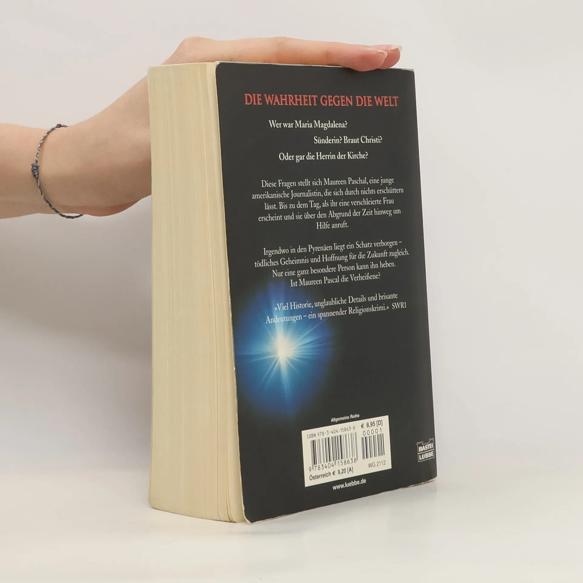 Wer war Maria Magdalena? Sünderin? Braut Christi? Oder gar die Herrin der Kirche? Diese Fragen stellt sich Maureen Paschal, eine junge amerikanische Journalistin, die sich durch nichts erschüttern lässt. Bis zu dem Tag, als ihr eine verschleierte Frau erscheint und sie über den Abgrund der Zeit um Hilfe anruft. Irgendwo in den Pyrenäen liegt ein Schatz verborgen - tödliches Geheimnis und Hoffnung für die Zukunft zugleich. Nur eine ganz besondere Person kann ihn heben. Ist Maureen Pascal die Verheißene?