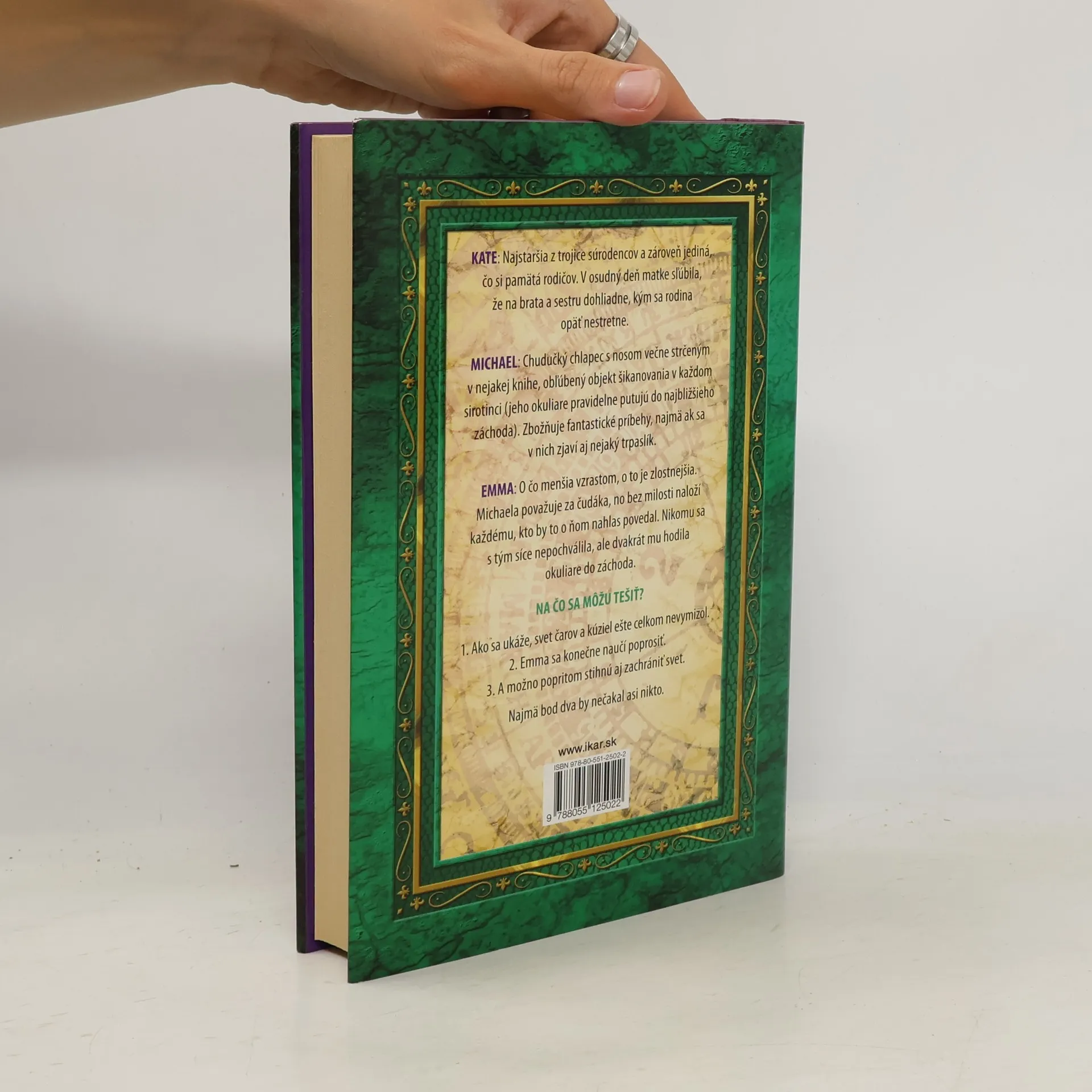 Uprostred decembrovej noci trojica detí prenasledovaná temnými silami náhlivo opúšťa svoj domov v sprievode záhadného starého muža. Ich rodičia nemajú inú možnosť, ak chcú deti zachrániť. Prejde desať rokov, no Kate, Michael a Emma nie sú o nič bližšie k odhaleniu pravdy o ich osude. Cesta k odpovedi sa skrýva v tajomnom atlase. Práve vďaka jeho čarovnej sile sa súrodenci ocitnú v krajine, ktorej kruto vládne Grófka s armádou svojich mŕtvych bojovníkov. Dobrodružstvo sa môže začať! Nebudú v ňom chýbať unesené deti, prazvláštne spojenectvá, krvilační vlci, bitky v hlbinách zeme, honosné plesy duchov, obri s mečmi a najmä knihy s vedomosťami nevýslovnej ceny. Smaragdový atlas je prvou zastávkou Kate, Emmy a Michaela na vzrušujúcej ceste do čarovného sveta, ale aj k poznaniu seba samých. Je to príbeh troch obyčajných detí, ktoré sa rozhodnú zachrániť svoju rodinu, aby napokon zachránili svet.