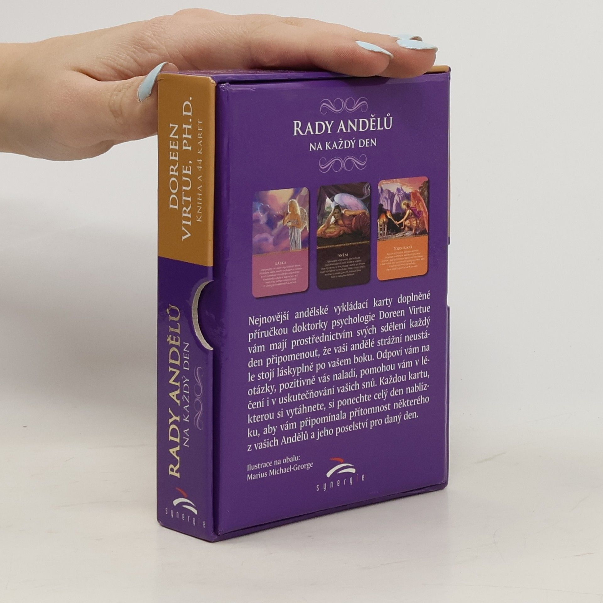 Kniha a 44 karet Andělské vykládací karty doplněné příručkou doktorky psychologie Doreen Virtue vám mají prostřednictvím svých sdělení každý den připomenout, že vaši andělé strážní neustále stojí láskyplně po vašem boku. Odpoví vám na otázky, pozitivně vás naladí, pomohou vám v léčení i v uskutečňování vašich snů. Každou kartu, kterou si vytáhnete, si ponechte celý den nablízku, aby vám připomínala přítomnost některého z vašich Andělů a jeho poselství pro daný den.