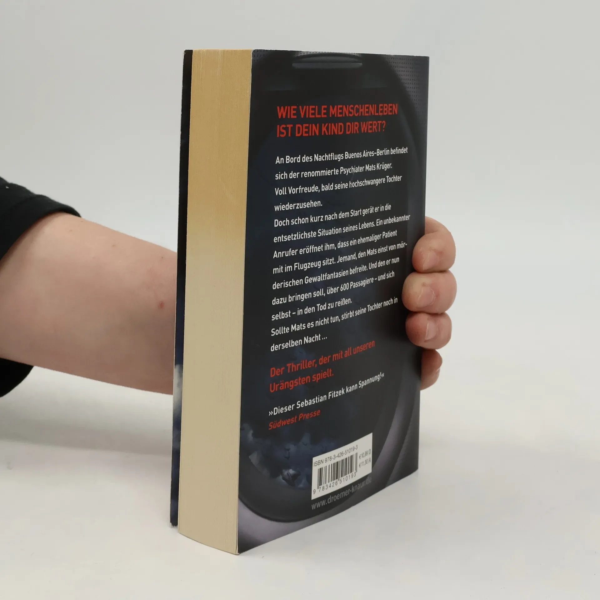 In diesem Psychothriller von Bestseller-Autor Sebastian Fitzek geht es um die tiefsten menschlichen Ängste des Eingeschlossenseins und der Hilflosigkeit in einem Flugzeug. Mats Krüger, ein erfolgreicher Psychiater, muss seine panische Flugangst überwinden, als seine hochschwangere Tochter Nele nach Jahren des Schweigens Kontakt zu ihm aufnimmt. Mats, der nach dem Tod seiner Frau nach Argentinien ausgewandert ist, wird gebeten, nach der Geburt des Babys zu helfen. Nach einem Flugangst-Seminar besteigt Mats den Langstreckenflug von Buenos Aires nach Berlin. Kurz nach dem Einnehmen seines Platzes wird ihm klar, dass er sich auf die falschen Ängste vorbereitet hat. Es sind nicht Turbulenzen oder Terrorwarnungen, die ihn in einen seelischen Ausnahmezustand versetzen, sondern ein Anruf eines Unbekannten. Dieser informiert ihn, dass sich ein ehemaliger Patient an Bord befindet, jemand, den Mats einst von mörderischen Gewaltphantasien befreite. Nun wird Mats gezwungen, zu verhindern, dass dieser Patient über 600 Passagiere und sich selbst in den Tod reißt. Ein packender Thriller, der die Grenzen der Psyche auslotet.