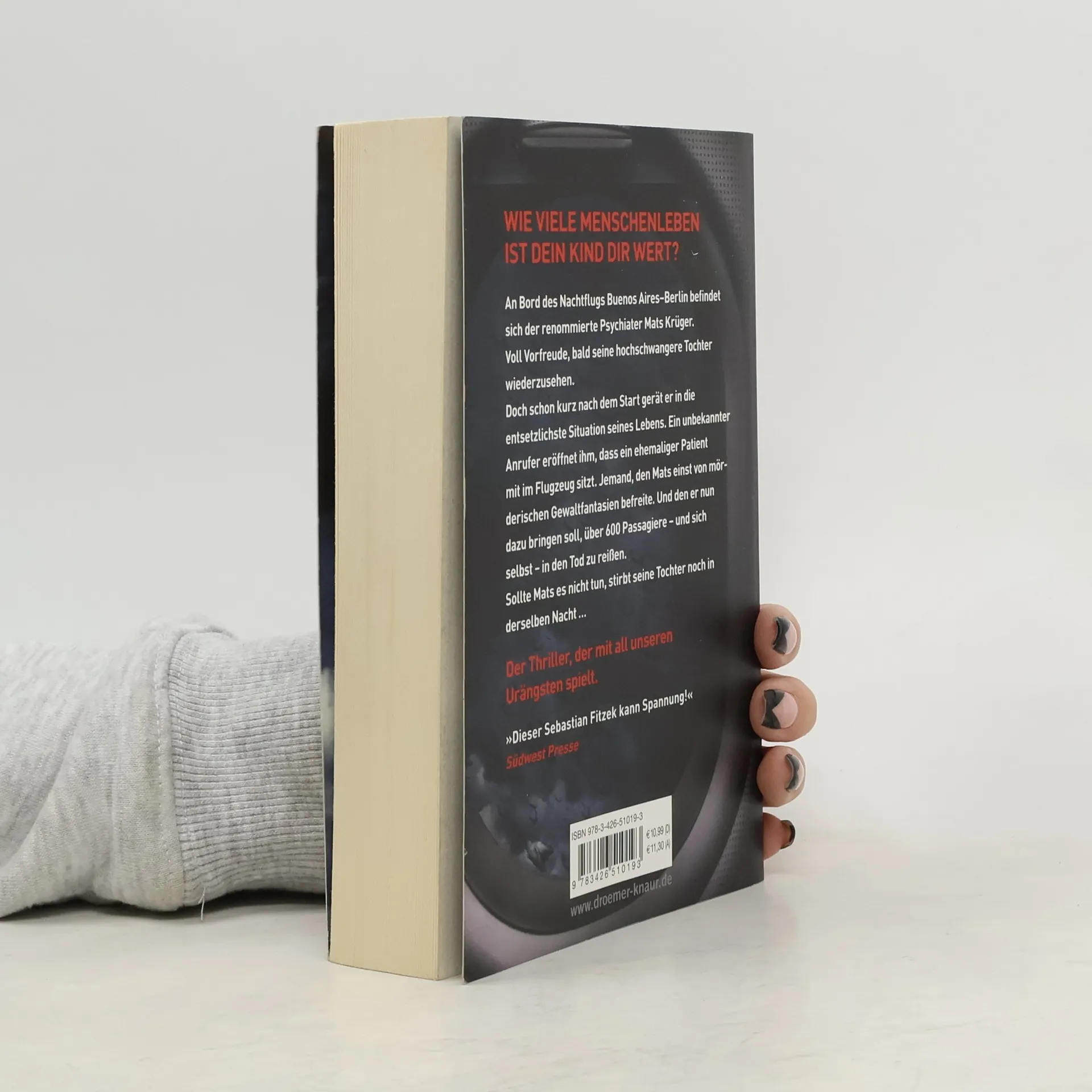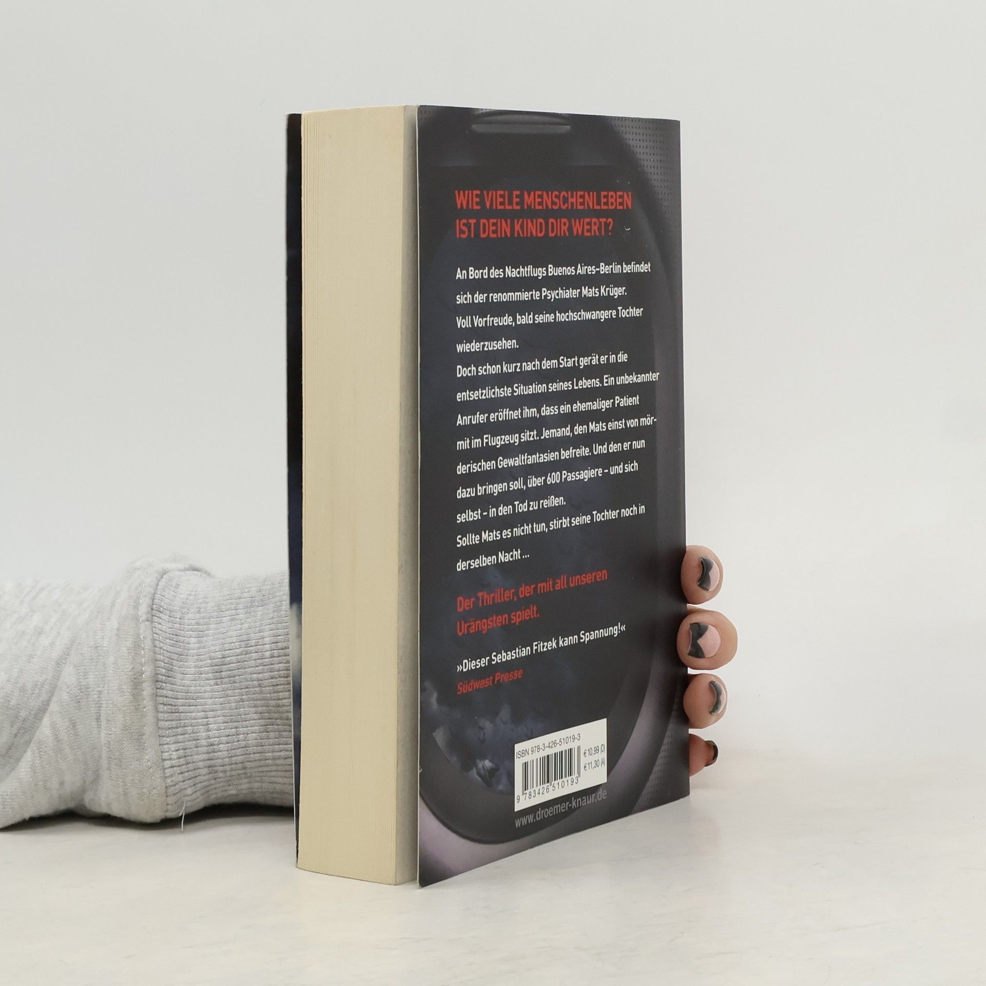 In diesem Psychothriller von Bestseller-Autor Sebastian Fitzek geht es um die tiefsten menschlichen Ängste des Eingeschlossenseins und der Hilflosigkeit in einem Flugzeug. Mats Krüger, ein erfolgreicher Psychiater, muss seine panische Flugangst überwinden, als seine hochschwangere Tochter Nele nach Jahren des Schweigens Kontakt zu ihm aufnimmt. Mats, der nach dem Tod seiner Frau nach Argentinien ausgewandert ist, wird gebeten, nach der Geburt des Babys zu helfen. Nach einem Flugangst-Seminar besteigt Mats den Langstreckenflug von Buenos Aires nach Berlin. Kurz nach dem Einnehmen seines Platzes wird ihm klar, dass er sich auf die falschen Ängste vorbereitet hat. Es sind nicht Turbulenzen oder Terrorwarnungen, die ihn in einen seelischen Ausnahmezustand versetzen, sondern ein Anruf eines Unbekannten. Dieser informiert ihn, dass sich ein ehemaliger Patient an Bord befindet, jemand, den Mats einst von mörderischen Gewaltphantasien befreite. Nun wird Mats gezwungen, zu verhindern, dass dieser Patient über 600 Passagiere und sich selbst in den Tod reißt. Ein packender Thriller, der die Grenzen der Psyche auslotet.