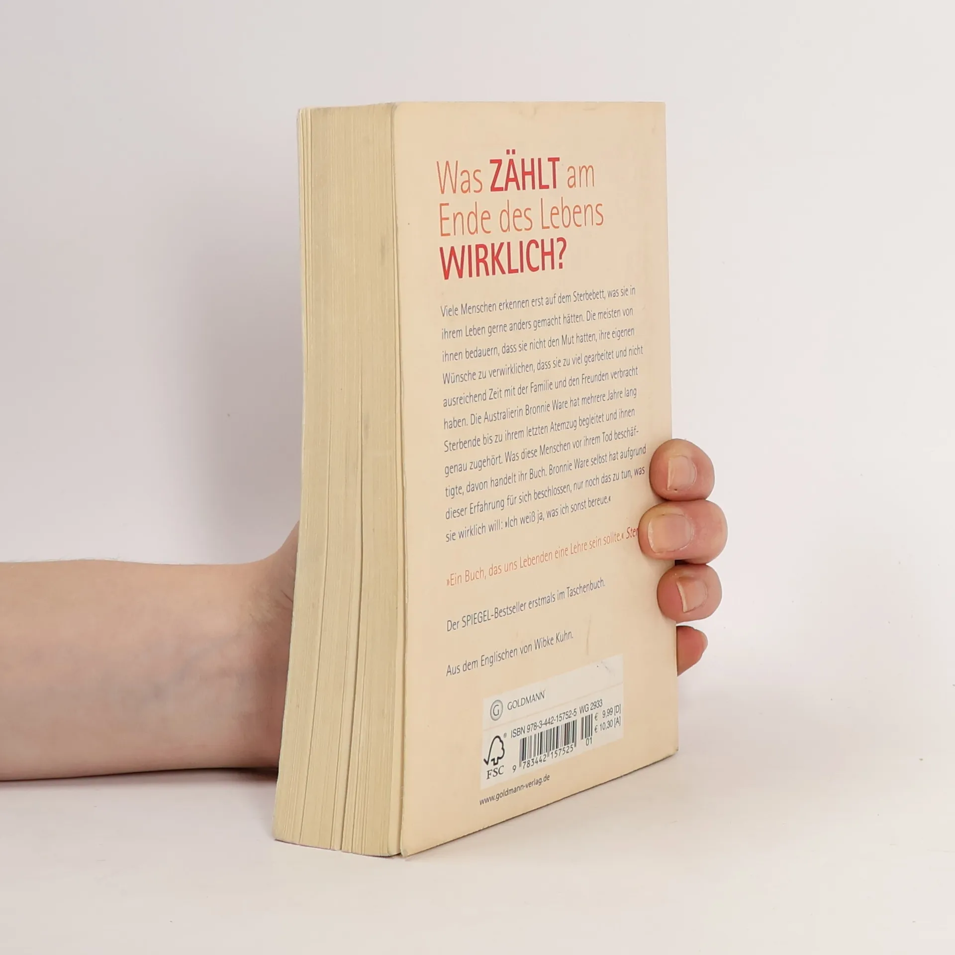 Was zählt am Ende des Lebens wirklich? Wenn man mit dem Tod konfrontiert ist, geht es nicht mehr um Geld. Um Macht. Um Ruhm. Sondern um ganz fundamentale Fragen: Hat man ausreichend Zeit mit der Familie und den Freunden verbracht? Bereut man es, Dinge getan oder, noch wichtiger, unterlassen zu haben? War man glücklich? Die Australierin Bronnie Ware hat mehrere Jahre lang Sterbende bis zu ihrem letzten Atemzug begleitet und ihnen genau zugehört. Was diese Menschen vor ihrem Tod beschäftigte, davon handelt ihr Buch. Ware selbst hat aufgrund dieser Erfahrung beschlossen, nur noch das zu tun, was sie wirklich will. Denn, so sagt sie, „ich weiß ja, was ich sonst bereue.“