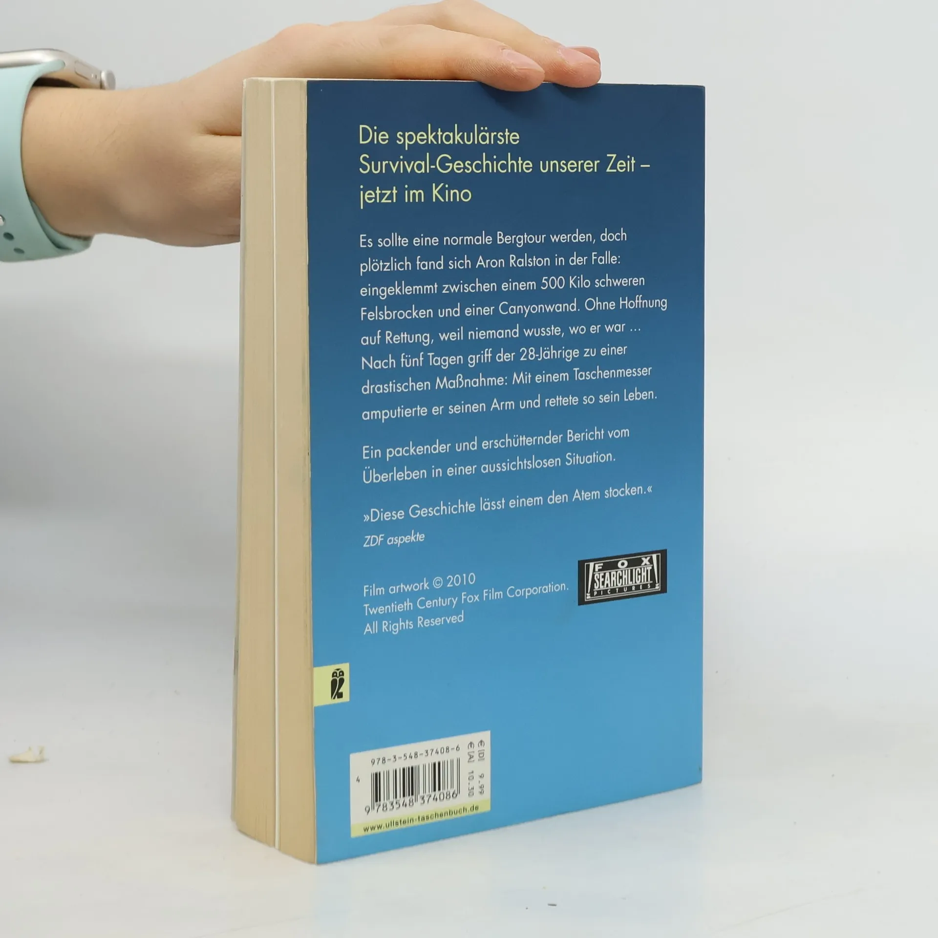 Eingeklemmt in einem entlegenen Wüsten-Canyon verbringt der amerikanische Solobergsteiger Ralston 5 Tage und Nächte, bevor er sich zur Amputation seiner rechten Hand entscheidet.