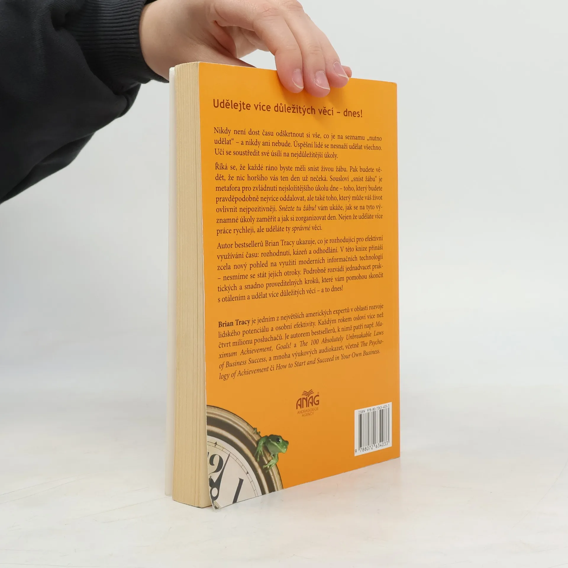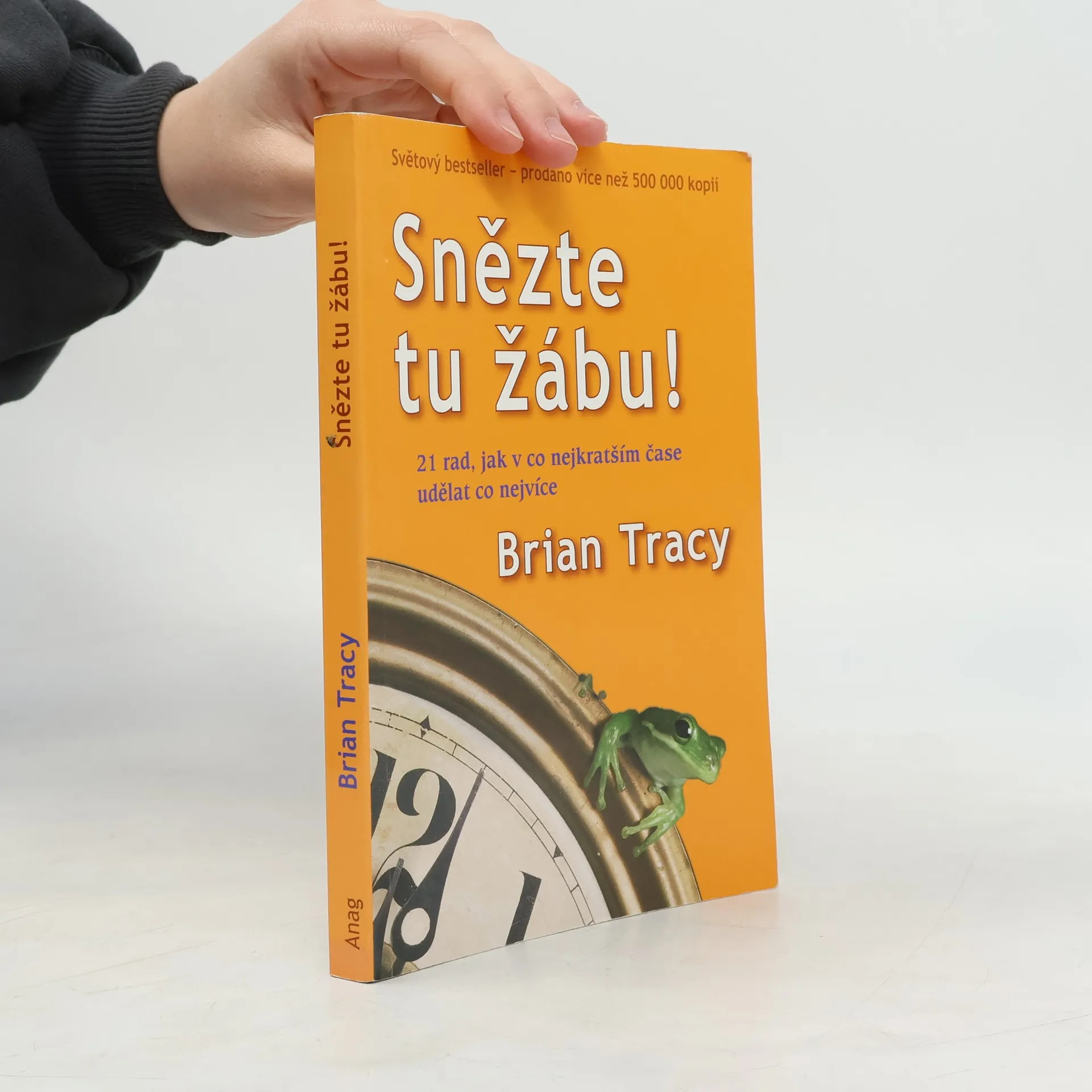 Tato knižní novinka je klíčem k velkému úspěchu, získání si respektu, dobrého postavení a ke šťastnému životu. Přináší zcela nový pohled na efektivní využití času pomocí 21 jednoduchých, ale zaručených metod, které používají úspěšní lidé po celém světě. Kniha vám ukáže cestu, jak skončit s otálením a udělat více důležitých věcí právě dnes. Změňte způsob svého myšlení a dosáhněte tak svých vytoužených cílů. Užíváním metafory "snězte tu žábu" učí Brian Tracy své čtenáře, jak se zbavit těch nejnáročnějších úkolů a zorganizovat si svůj čas. Neznamená to však splnit více povinností, ale dělat jen ty správné věci. Pouze ty mohou, podle jednoho z největších amerických expertů v oblasti rozvoje lidského potenciálu a osobní efektivity, přinést více úspěchu, peněz, ale také volného času a tím změnit Váš život k lepšímu - jednou provždy! Knihy Snězte tu žábu! se po světě prodalo více než 500 000 výtisků a tím se zařadila mezi světové bestsellery. Nakladatelství Anag ji nyní vydalo i pro ČR.