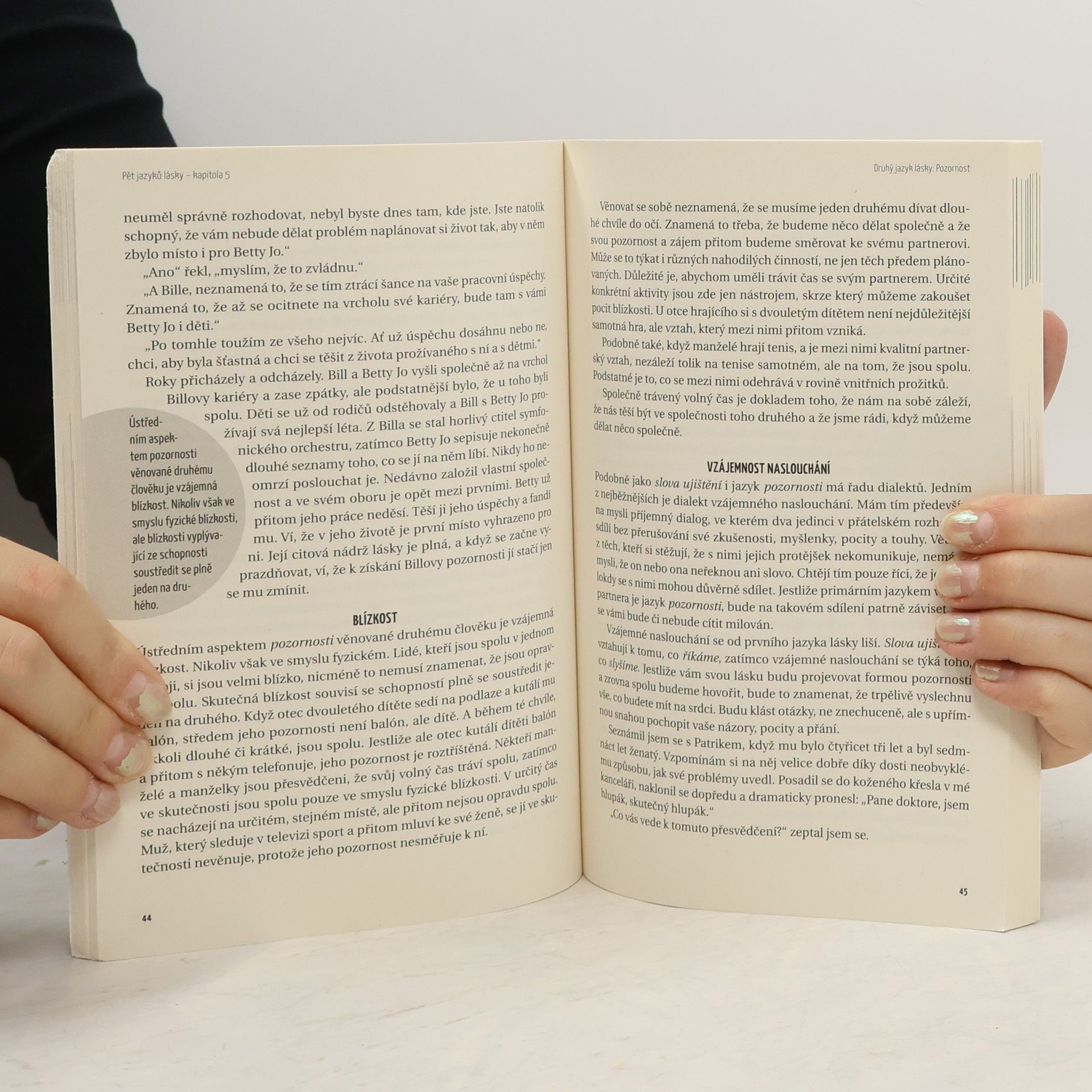 Tato kniha má potenciál výrazně zlepšit mezilidské vztahy. Zjistíme zde, že každý umí vyjadřovat a přijímat lásku jiným způsobem a proto zbytečně vznikají časté konflikty, že se cítíme nepochopeni a naše snaha nedoceněná. Toto dílo mnohé objasní.