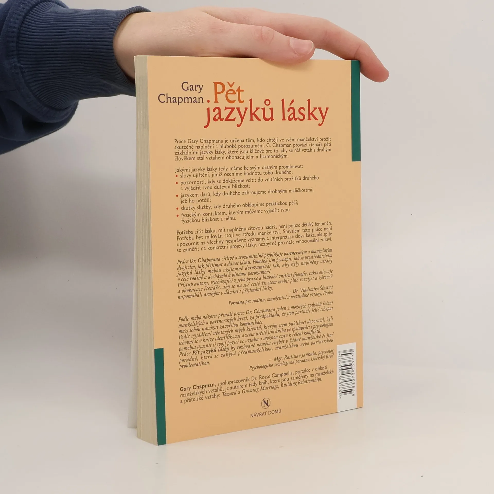 Práce Gary Chapmana je určena těm, kdo chtějí ve svém manželství prožít skutečné naplnění a hluboké porozumění. G. Chapman provází čtenáře pěti základními jazyky lásky, které jsou klíčové pro to, aby se náš vztah s druhým člověkem stal vztahem obohacujícím a harmonickým.