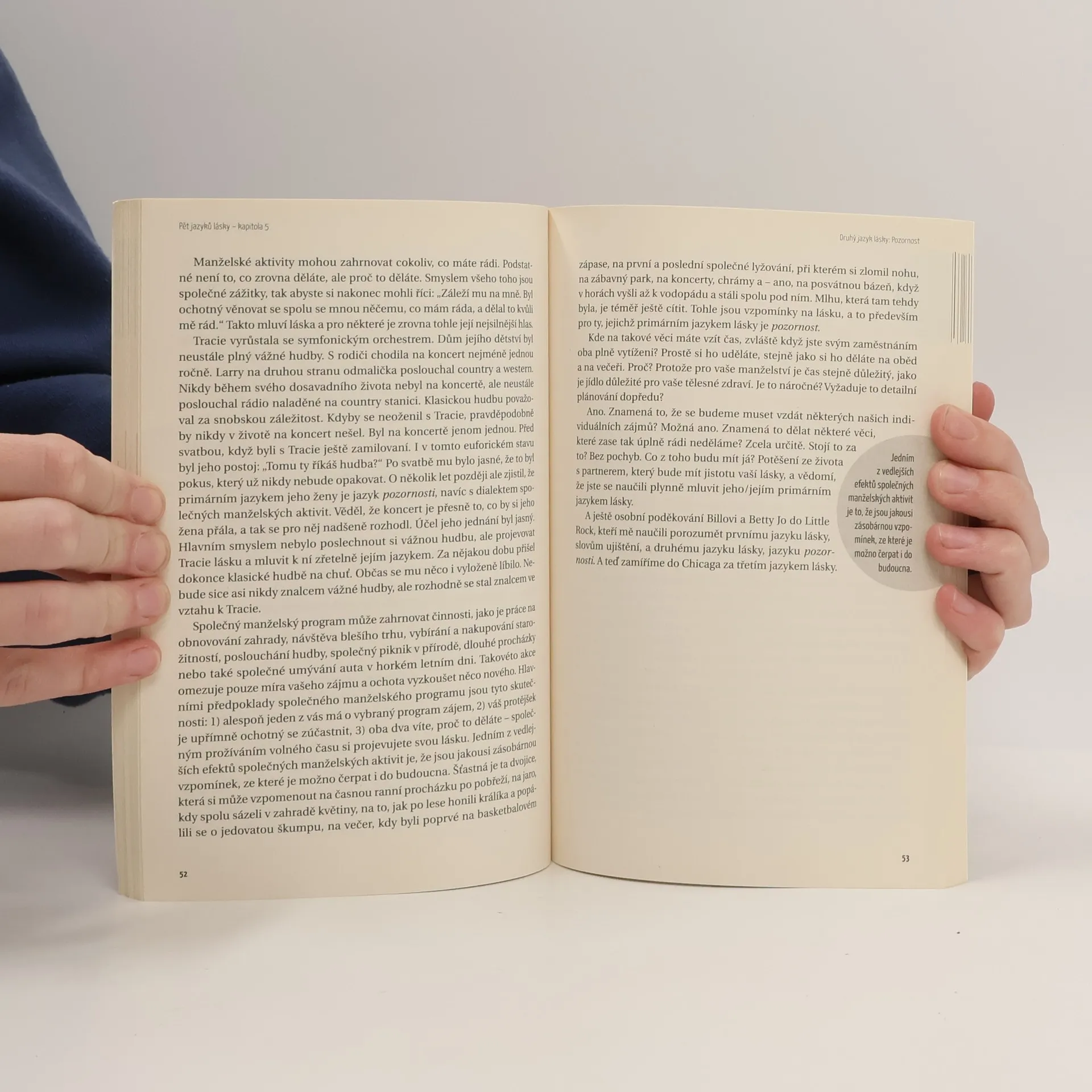 Tato kniha má potenciál výrazně zlepšit mezilidské vztahy. Zjistíme zde, že každý umí vyjadřovat a přijímat lásku jiným způsobem a proto zbytečně vznikají časté konflikty, že se cítíme nepochopeni a naše snaha nedoceněná. Toto dílo mnohé objasní.