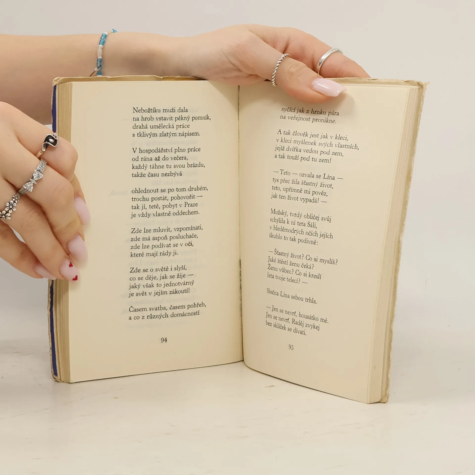 Veršované povídky, téma postavení žen ve společnosti, epická poezie, příběhy žen a jejich neutěšené postavení ve společnosti (žena je bytost citová, ale pasivní, je odsouzena žít v nevyrovnaném manželství a postavení, společnost jí nedopřává rozvoj). Básníkova matka po denní práci ráda odpočívala na balkoně s dvěma knížkami v rukou, ale nikdo z rodiny je nikdy nečetl ani neprohlížel. Teprve po její smrti si děti dovolily knížky prohlédnout. Byly to Hálkovy Večerní písně a Máchův Máj, ve kterém bylo datum a pod ním křížek...