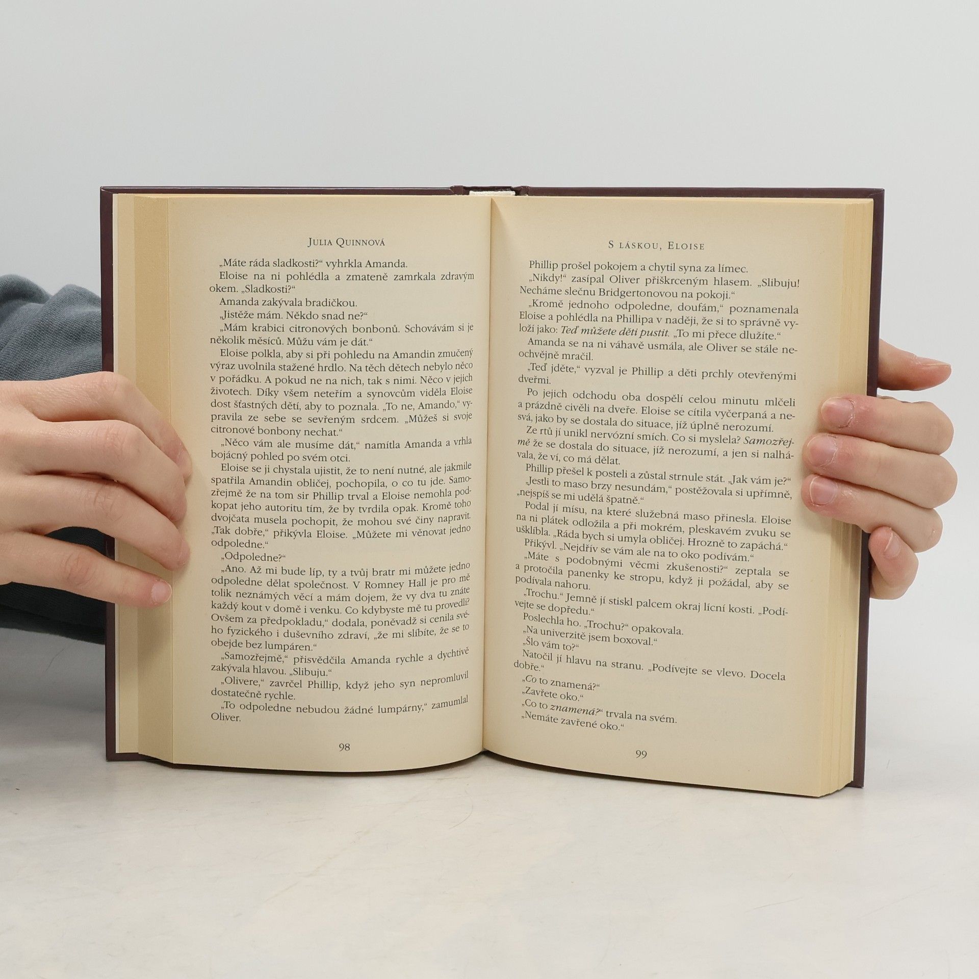 Rok 1824. Ovdovělý sir Phillip ví, že Eloise Bridgertonová je stará panna, a tak ji požádá o ruku. Domnívá se totiž, že je to prostá, nenáročná dívka, která zoufale čeká na nabídku k sňatku. Avšak krásná žena na jeho prahu rozhodně není nesmělá, a pokud přestane mluvit na dostatečně dlouhou dobu, aby zavřela ústa, on ji tolik touží políbit… To si myslí, že jí přeskočilo? Eloise Bridgertonová by se rozhodně neprovdala za muže, jehož nikdy neviděla! Ale potom začne přemýšlet… a pochybovat… a než pochopí, jak se to stalo, sedí uprostřed noci v pronajatém kočáru a jede za mužem, jenž, jak doufá, se k ní skvěle hodí. Jenže tomu tak není. Dokonalý manžel by se nechoval tak náladově a nevycválaně, a přestože je sir Phillip bezesporu pohledný, je to tupec, hrubián a neotesanec zcela se lišící od londýnských džentlmenů, kteří se předhánějí v žádostech o její ruku. Jakmile se však usměje… a políbí ji…, okolní svět zmizí a ona jen žasne…, může pro ni být tento nedokonalý muž dokonalým? První vydání.