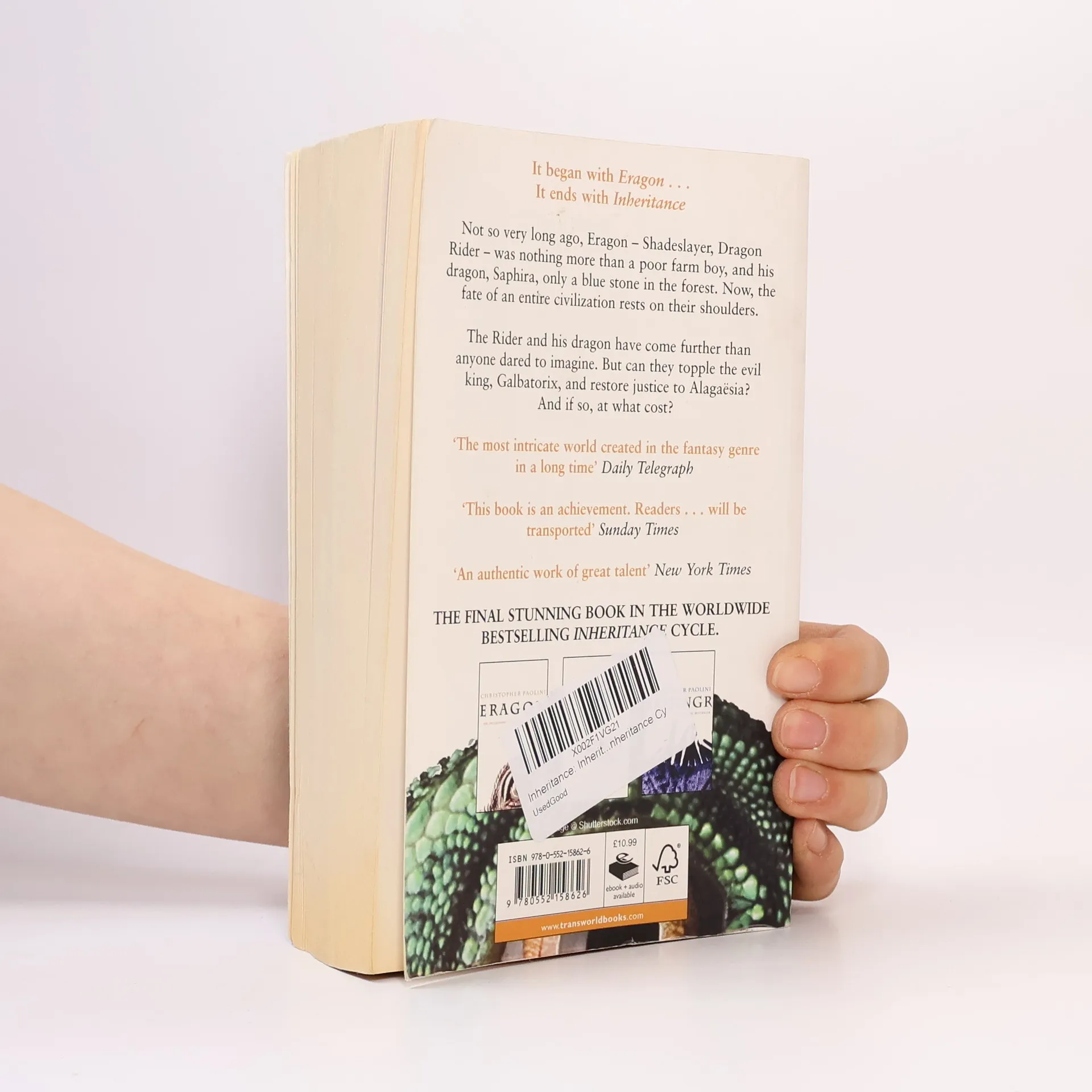 It began with Eragon .It ends with InheritanceNot so very long ago, Eragon - Shadeslayer, Dragon Rider - was nothing more than a poor farm boy, and his dragon, Saphira, only a blue stone in the forest. The Rider and his dragon have come further than anyone dared to imagine.