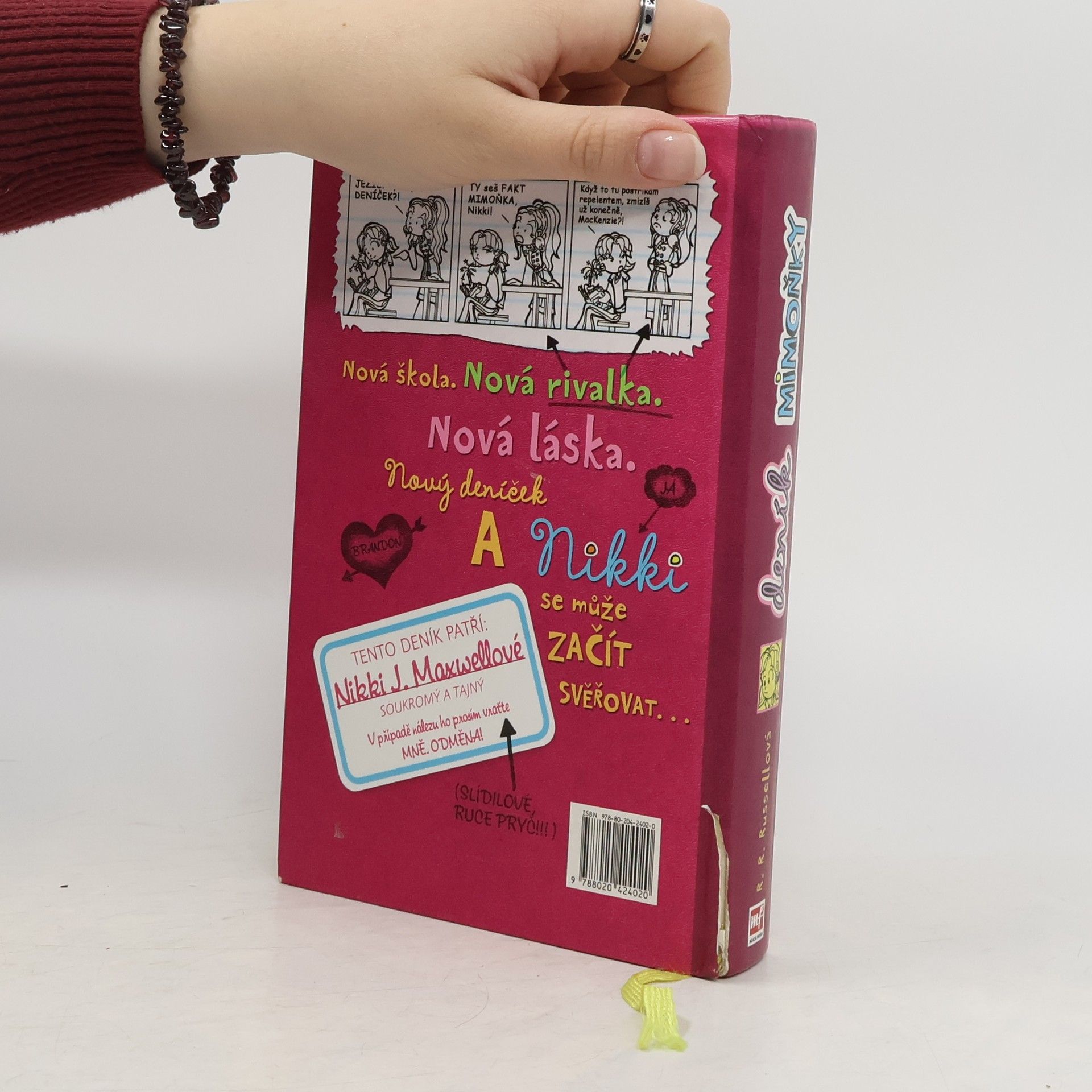 Nestačí, že Nikki J. Maxwellová má otce, který se živí hubením brouků. Ještě se kvůli tomu dostane do prestižní soukromé školy, kam moc nezapadá. Z pohledu její zapřisáhlé nepřítelkyně MacKenzie, dokonalé dívky, která má vše, co je třeba, je Nikki prostě „mimoňka“. A toto je její deník. Zachycující příhody každodenního života, například jak si chtěla z naslouchátka vyrobit luxusní hands-free, jak se snažila sbalit nejhezčího kluka a co zažívala se svými novými kamarádkami, Chloe a Zoey. Doplněno výstižnými ilustracemi. První vydání.