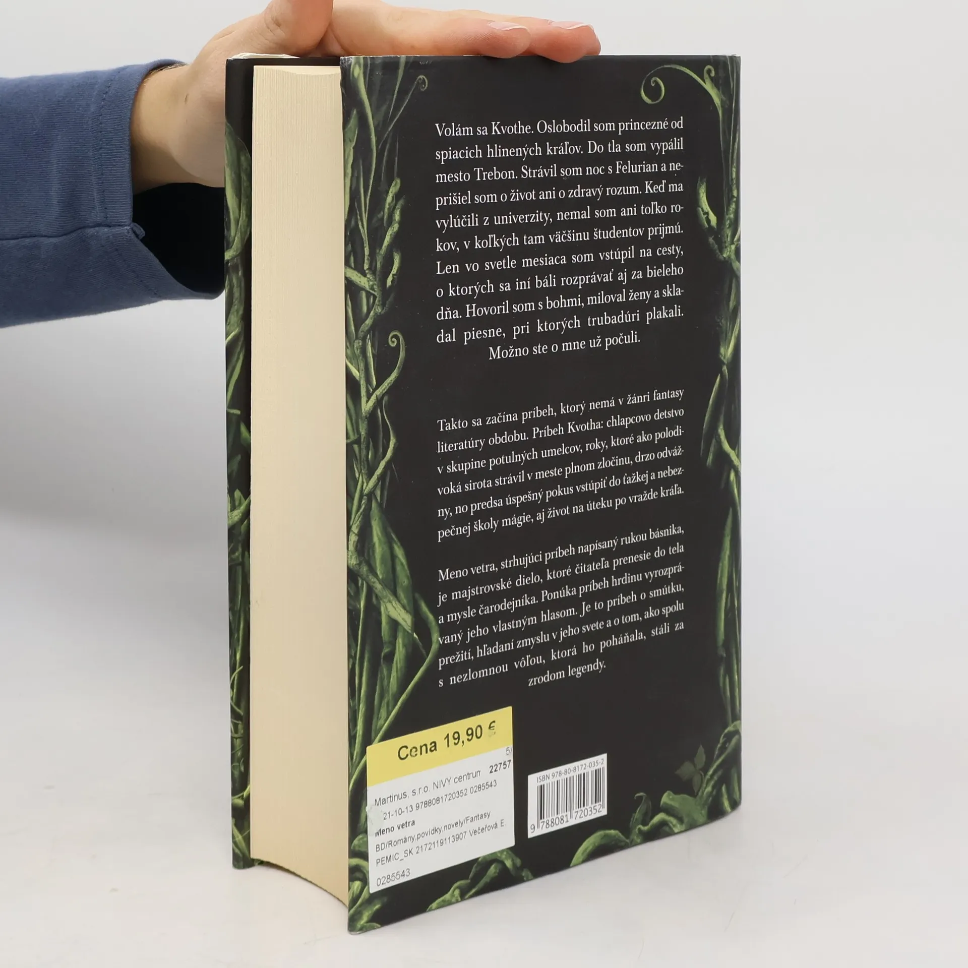 "Volám sa Kvothe. Oslobodil som princezné od spiacich hlinených kráľov. Do tla som vypálil mesto Trebon. Strávil som noc s Felurian a neprišiel som o život ani o zdravý rozum. Keď ma vylúčili z univerzity, nemal som ani toľko rokov, v koľkých tam väčšinu študentov prijmú. Len vo svetle mesiaca som vstúpil na cesty, o ktorých sa iní báli rozprávať aj za bieleho dňa. Hovoril som s bohmi, miloval ženy a skladal piesne, pri ktorých trubadúri plakali. Možno ste o mne už počuli." Takto sa začína príbeh, ktorý nemá v žánri fantasy literatúry obdobu. Príbeh Kvotha: chlapcovo detstvo v skupine potulných umelcov, roky, ktoré ako polodivoká sirota strávil v meste plnom zločinu, drzo odvážny, no predsa úspešný pokus vstúpiť do ťažkej a nebezpečnej školy mágie, aj život na úteku po vražde kráľa. Meno vetra, strhujúci príbeh napísaný rukou básnika, je majstrovské dielo, ktoré čitateľa prenesie do tela a mysle čarodejníka. Ponúka príbeh hrdinu vyrozprávaný jeho vlastným hlasom. Je to príbeh o smútku, prežití, hľadaní zmyslu v jeho svete a o tom, ako spolu s nezlomnou vôľou, ktorá ho poháňala, stáli za zrodom legendy.
