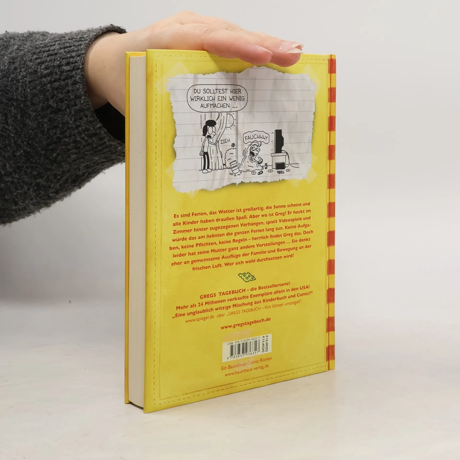"Es sind Ferien, das Wetter ist großartig, die Sonne scheint und alle Kinder haben draußen Spaß. Aber wo ist Greg? Er hockt im Zimmer hinter zugezogenen Vorhängen, spielt Videospiele und würde das am liebsten die ganzen Ferien lang tun. Keine Aufgaben, keine Pflichten, keine Regeln - herrlich findet Greg das. Doch leider hat seine Mutter ganz andere Vorstellungen ... Sie denkt eher an gemeinsame Ausflüge mit der Familie und Bewegung an der frischen Luft. Wer sich wohl durchsetzen wird?" (Verlagsangabe)
