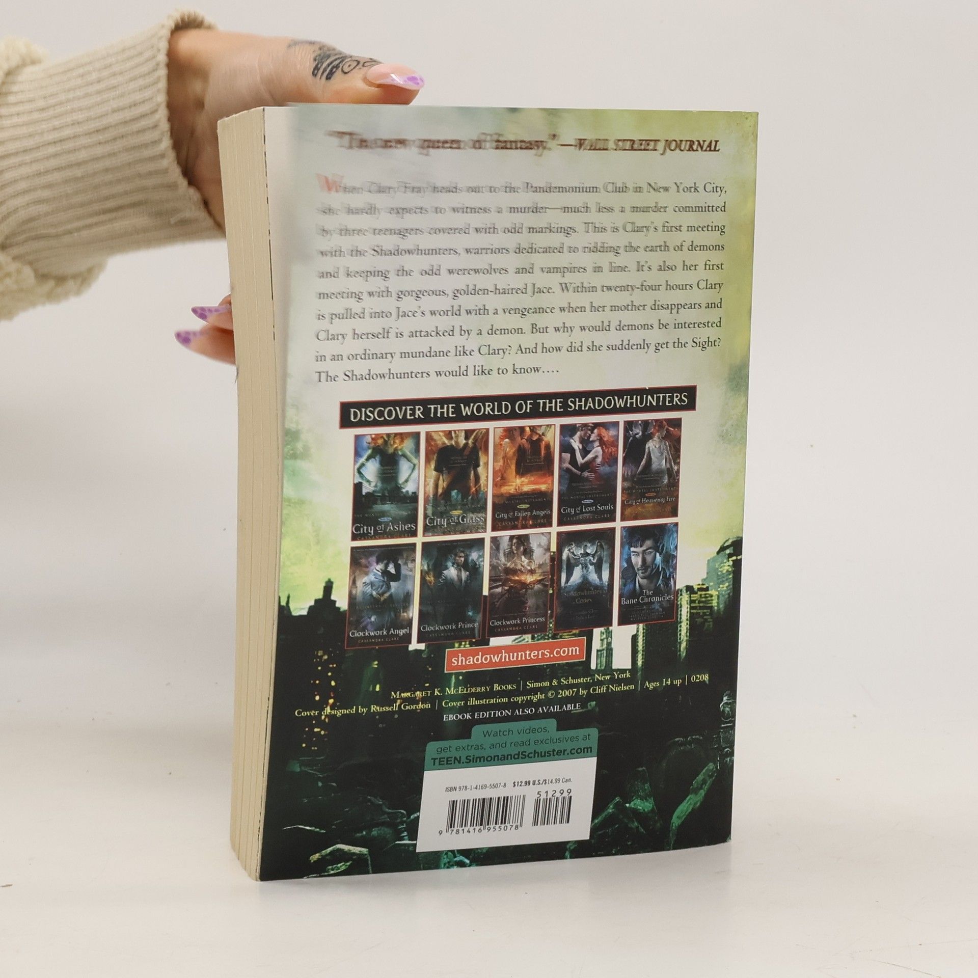 When Clary Fray heads out to the Pandemonium Club in New York City, she hardly expects to witness a murder. Much less a murder commited by three teenagers covered with odd markings. This is Clary's first meeting with the Shadowhunters, warriors dedicated to ridding the earth of demons--and keeping the odd werewolves and vampires in line. It's also her first meeting with gorgeous, golden-haired Jace. Within twenty-four hours Clary is pulled into Jace's world with a vengeance, when her mother disappears and Clary herself is attacked by a demon. But why would demons be interested in an ordinary mundane like Clary? And how did she suddenly get the Sight? The Shadowhunters would like to know.... Librarian's note: See alternate cover editions with this ISBN here and here.