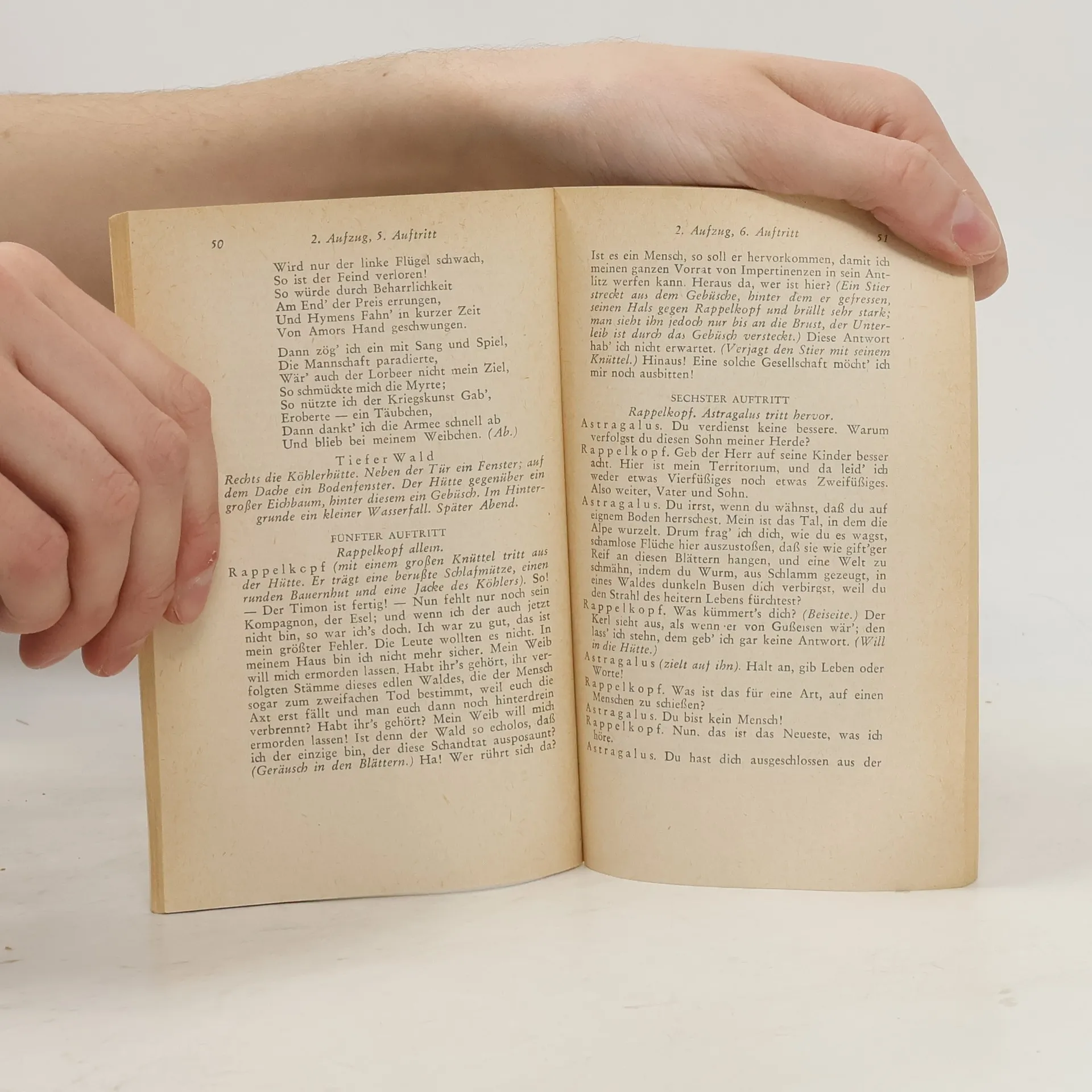 Überall wittert Rappelkopf Verschwörung, Verrat und Hinterlist, selbst in der unschuldigen Liebe seiner Tochter zum Maler August und in der Güte seiner Frau. Erst nach allerlei Verwicklungen und durch das Eingreifen einer Naturgewalt in Gestalt des Alpenkönigs Astragalus erfährt der Menschenfeind in Raimunds romantischkomischem Zauberspiel am Ende Selbsterkenntnis und Heilung.