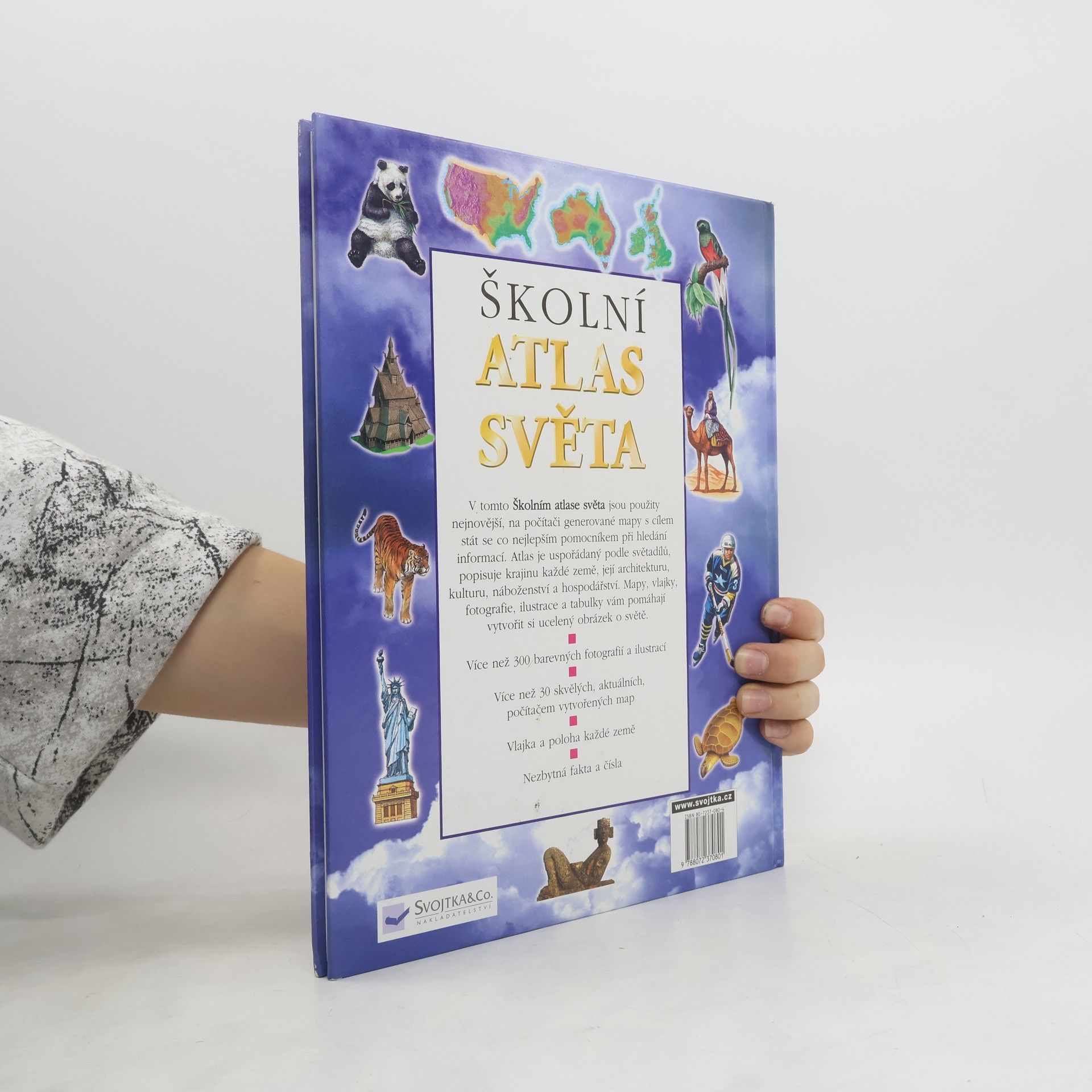V tomto školním atlase světa jsou použity mapy s cílem stát se co nejnovějším pomocníkem při hledání informací. Atlas je uspořádaný podle světadílů, popisuje krajinu každé země, její architekturu, kulturu, náboženství a hospodářství.