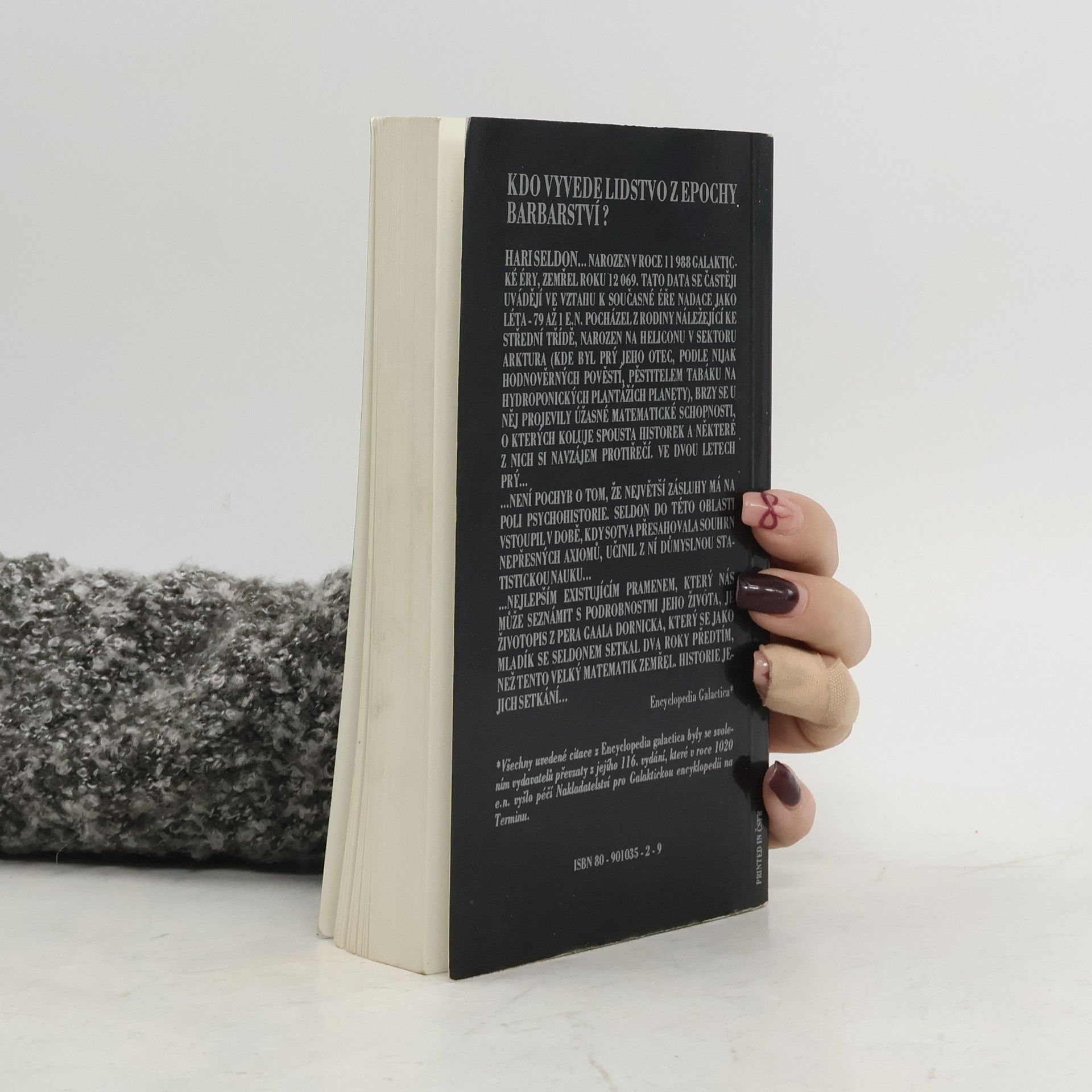 "Hary Seldon… narozen v roce 11 988 galaktické éry, zemřel roku 12 069. Tato data se častěji uvádějí ve vztahu k současné éře Nadace jako léta – 79 až 1 e.n.. Pocházel z rodiny náležející ke střední třídě, narozen na Heliconu v sektoru Arktura (kde byl prý jeho otec, podle nijak hodnověrných pověstí, pěstitelem tabáku na hydroponických plantážích planety), brzy se u něj projevily úžasné matematické schopnosti, o kterých koluje spousta historek a některé z nich se navzájem protiřečí. Ve dvou letech prý… …není pochyb o tom, že největší zásluhy má na poli psychohistorie. Seldon do této oblasti vstoupil v době, kdy sotva přesahovala souhrn nepřesných axiomů, učinil z ní důmyslnou statistickou nauku… …nejlepším existujícím pramenem, který nás může seznámit s podrobnostmi jeho života, je životopis z pera Gaala Dornicka, který se jako mladík se Seldonem dva roky předtím než tento velký matematik zemřel. Historie jejich setkání…" Encyclopedia Galactica' 'všechny uvedené citace z Encyclopedia Galactica byly se svolením vydavatelů převzaty z jejího 116. vydání, které v roce 1020 e.n. vyšlo péčí Nakladatelství pro Galaktickou encyklopedii na Terminu.... celý text