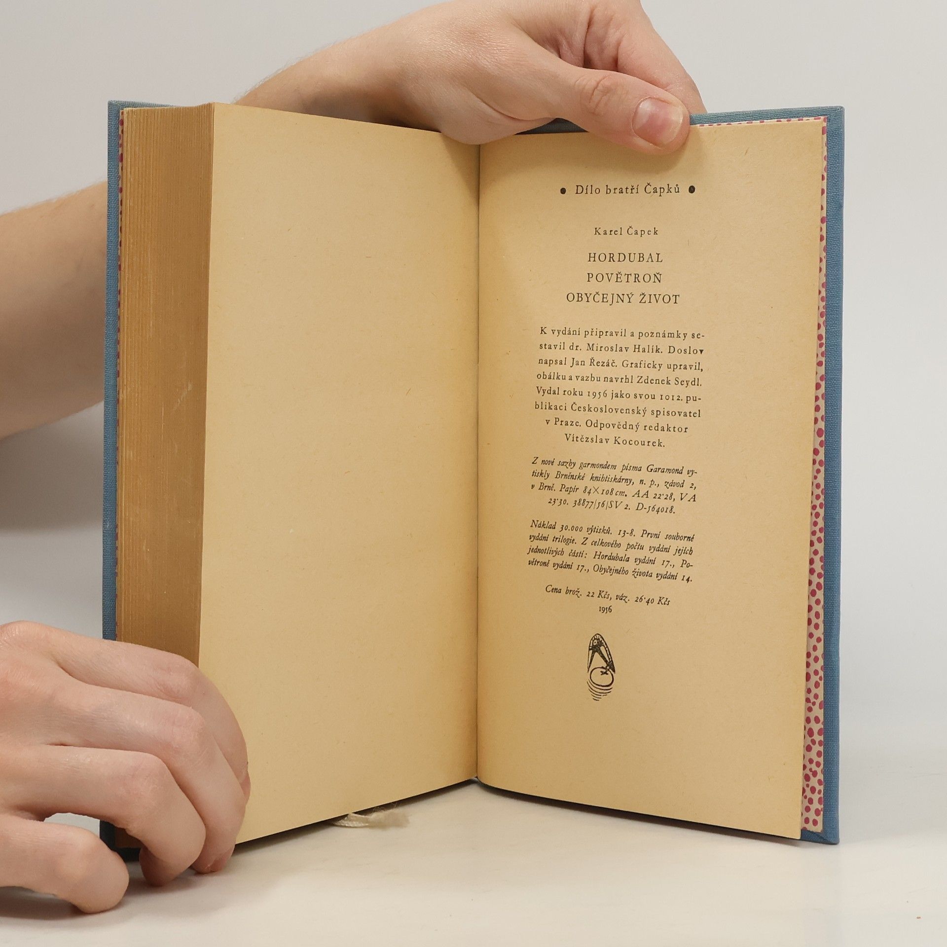 Románová trilogie z let 1934-35 je trojím pokusem spisovatele a filosofa o hlubší a pravdivější pochopení člověka v jeho citech a počínání. "Hordubal" je baladický příběh podkarpatoruského horala, vystěhovalce, který po návratu domů nachází lhostejnou ženu i dítě. S pokorou prostého člověka nese svůj osud klamaného muže až k tragickému konci... V "Povětroni" několik lidí (ošetřovatelka, jasnovidec a lékař) konstruuje z několika fakt pravděpodobný osud zřítivšího se umírajícího letce... "Obyčejný život" je rekapitulace života železničního přednosty v pensi, jemuž se život vlivem rozdílných povahových rysů zděděných po předcích, jeví nesmírným bludištěm, z něhož nemůže vlastní vůlí najít správné východisko... Trilogie nemá ani jednu společnou postavu. Jednotlivé části spojuje jen umělecká metoda či spisovatelův záměr. I přes nesprávný filosofický názor je trilogie významné umělecké dílo, bohaté na nové poznatky a postřehy, přitažlivé a svou stavbou odvážné. Obálka, vazba a úprava: Zdenek Seydl