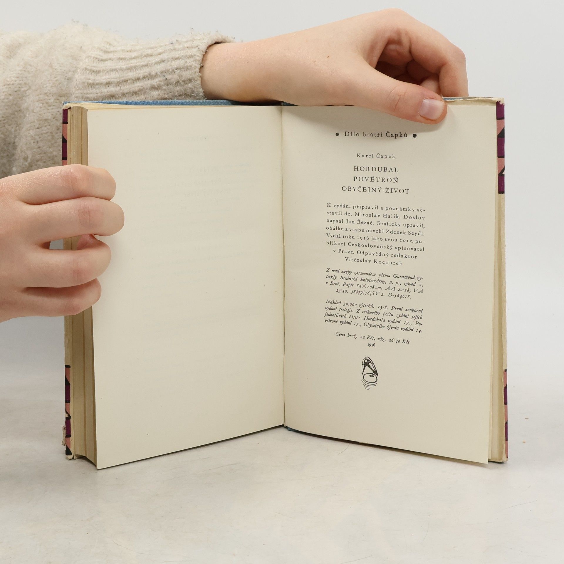 Románová trilogie z let 1934-35 je trojím pokusem spisovatele a filosofa o hlubší a pravdivější pochopení člověka v jeho citech a počínání. "Hordubal" je baladický příběh podkarpatoruského horala, vystěhovalce, který po návratu domů nachází lhostejnou ženu i dítě. S pokorou prostého člověka nese svůj osud klamaného muže až k tragickému konci... V "Povětroni" několik lidí (ošetřovatelka, jasnovidec a lékař) konstruuje z několika fakt pravděpodobný osud zřítivšího se umírajícího letce... "Obyčejný život" je rekapitulace života železničního přednosty v pensi, jemuž se život vlivem rozdílných povahových rysů zděděných po předcích, jeví nesmírným bludištěm, z něhož nemůže vlastní vůlí najít správné východisko... Trilogie nemá ani jednu společnou postavu. Jednotlivé části spojuje jen umělecká metoda či spisovatelův záměr. I přes nesprávný filosofický názor je trilogie významné umělecké dílo, bohaté na nové poznatky a postřehy, přitažlivé a svou stavbou odvážné. Obálka, vazba a úprava: Zdenek Seydl