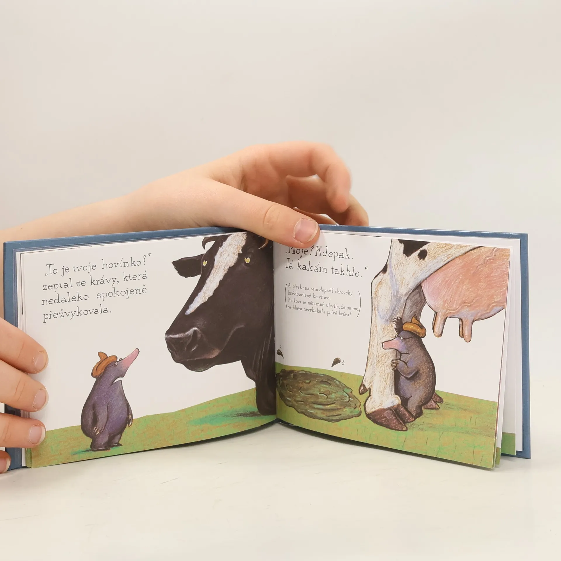 Dnes už kultovní knížka, kterou ocení lidé s nadhledem a smyslem pro humor. Vypráví o zvídavém krtkovi, jenž putuje od zvířátka ke zvířátku a zjišťuje, komu patří ta nevábně páchnoucí kupička na jeho hlavě. Osobitě vtipná knížka s půvabnými ilustracemi je určena malým i velkým milovníkům nekorektní legrace.