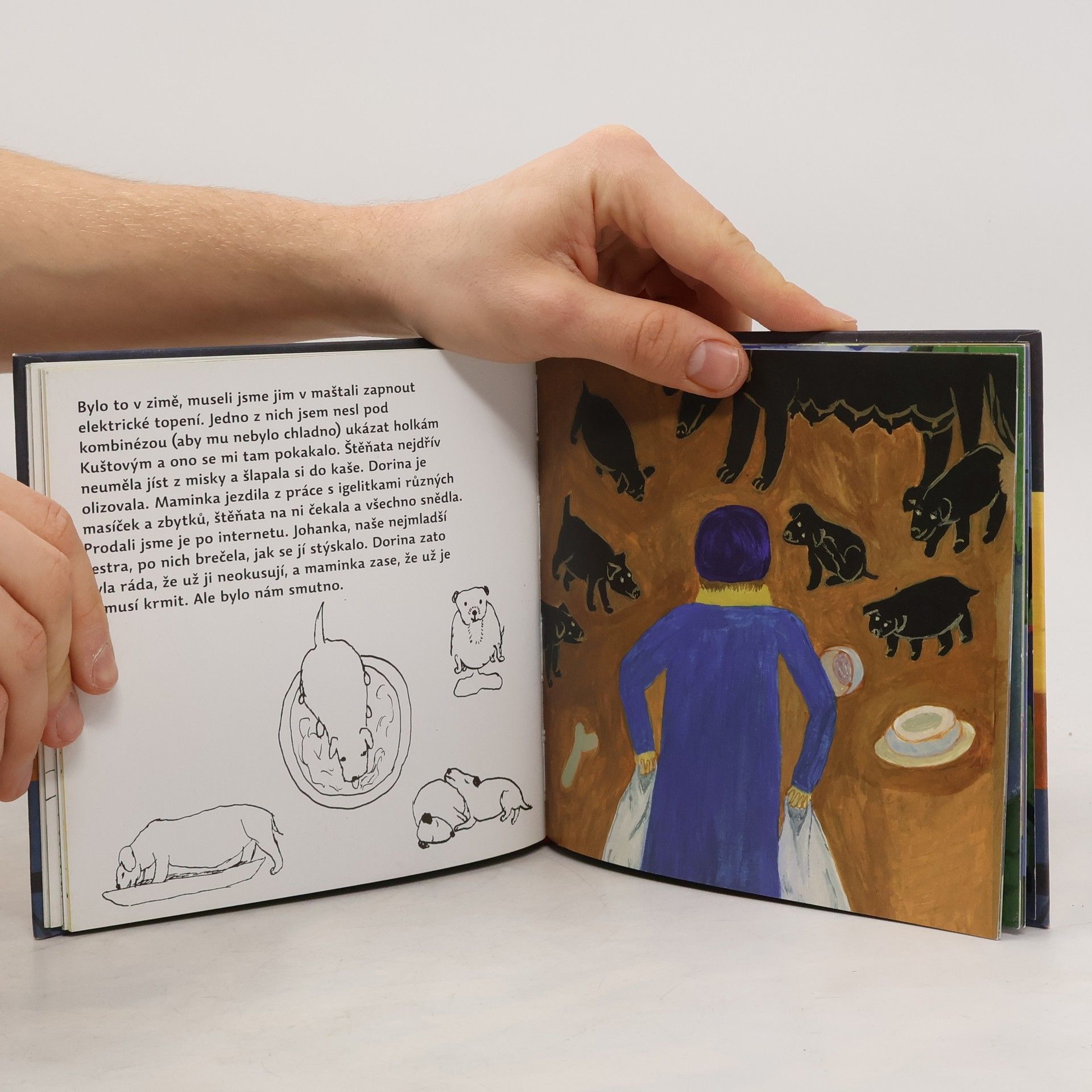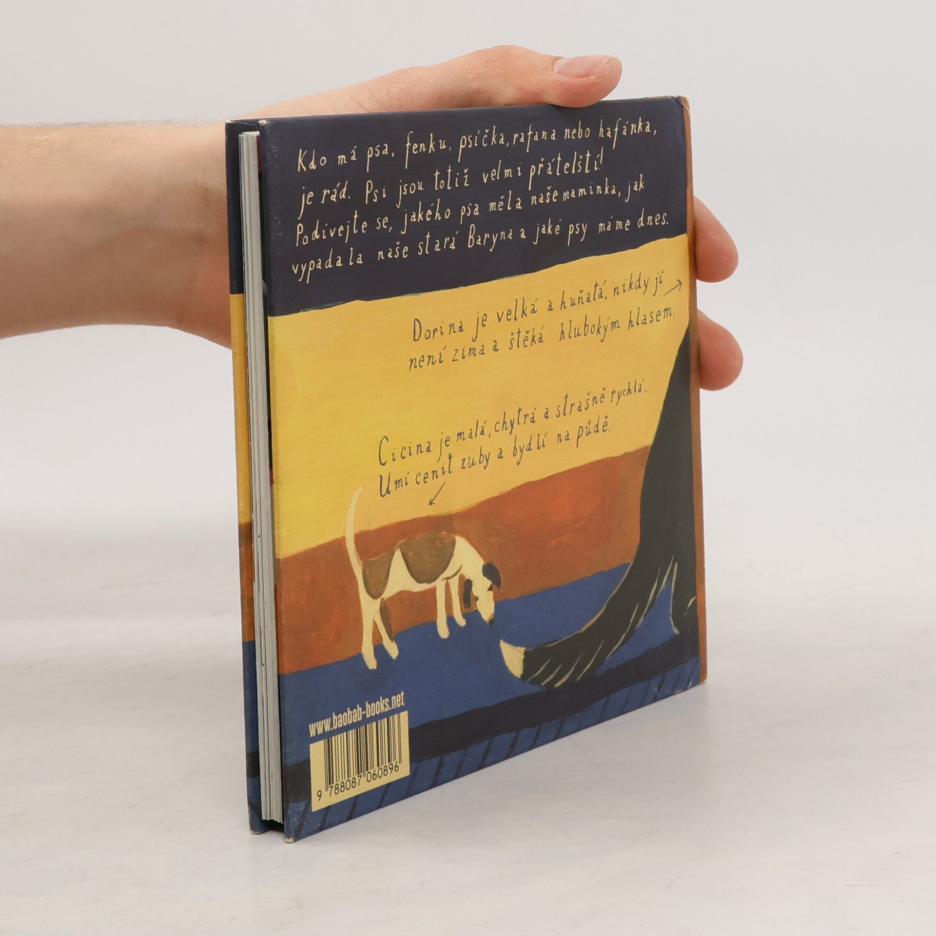 Kdo má psa, fenku, psíčka, rafana nebo hafánka je moc rád, psi jsou totiž velmi přátelští! Podívejte se jakého psa měla naše maminka, jak vypadala naše stará Baryna a jaké psy máme dnes. Cicina je malá, chytrá a strašně rychlá. Umí cenit zuby a bydlí na půdě. Dorina je velká a huňatá, nikdy jí není zima a štěká hlubokým hlasem. Tereza Říčanová opět bez sentimentu a tentokrát skrze psy, vypráví slovem i obrazem o domově a každodenních maličkostech, ale taky o zrození, smrti a věrnosti, jak jinak. Tereza Říčanová je ztělesněním autorského pohledu na dětskou literaturu. Tato malířka, spisovatelka a performerka je jako vichřice: razantní malby, které jistě ovlivnil jak expresionismus, tak tvorba naivistů, lapidární a přitom nezaměnitelně krásné texty inspirované dětskou myslí, to vše tvoří dohromady knihy, které otevírají dětem zcela jedinečný pohled na lidský život. Ten je v jejím podání vždy svázán se základními otázkami lidského bytí: ať už vypráví o slavení svátků nebo o kozách... všednost venkovských dnů je existence sama: zpěv písní, biblické příběhy, zvířecí i lidský koloběh. A tak je to i v Psí knížce, volném pokračování autorčiny série ze života na statku.